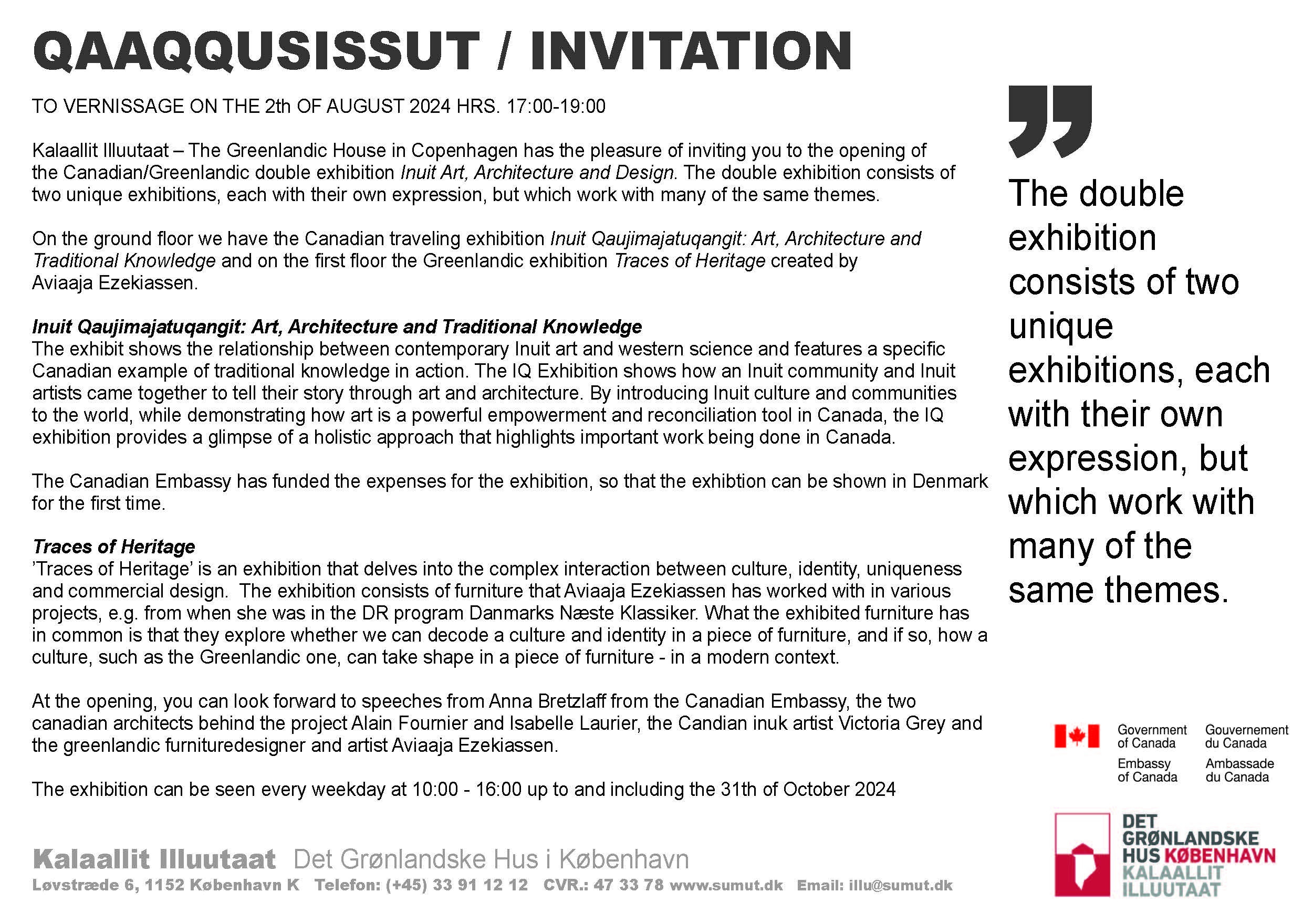 The official opening of the international Inuit Qaujimajatuqangit; art, architecture and traditional Knowledge traveling exhibition was held at Det Gronlandske Hus Kobenhavn (Greenlandic House) Kalaallit Illuutaat, on August 2nd in the presence of the Canadian Ambassador Carolyn Bennet, Leise Johnsen, director of the Greenlandic House and Sarah Olsvig, International Chair of the Inuit Circumpolar Council. Alain Fournier, Architect, Founding Partner and Director of EVOQ was accompanied by Isabelle Laurier, curation consultant. The exhibition will remain until October 31st 2024.