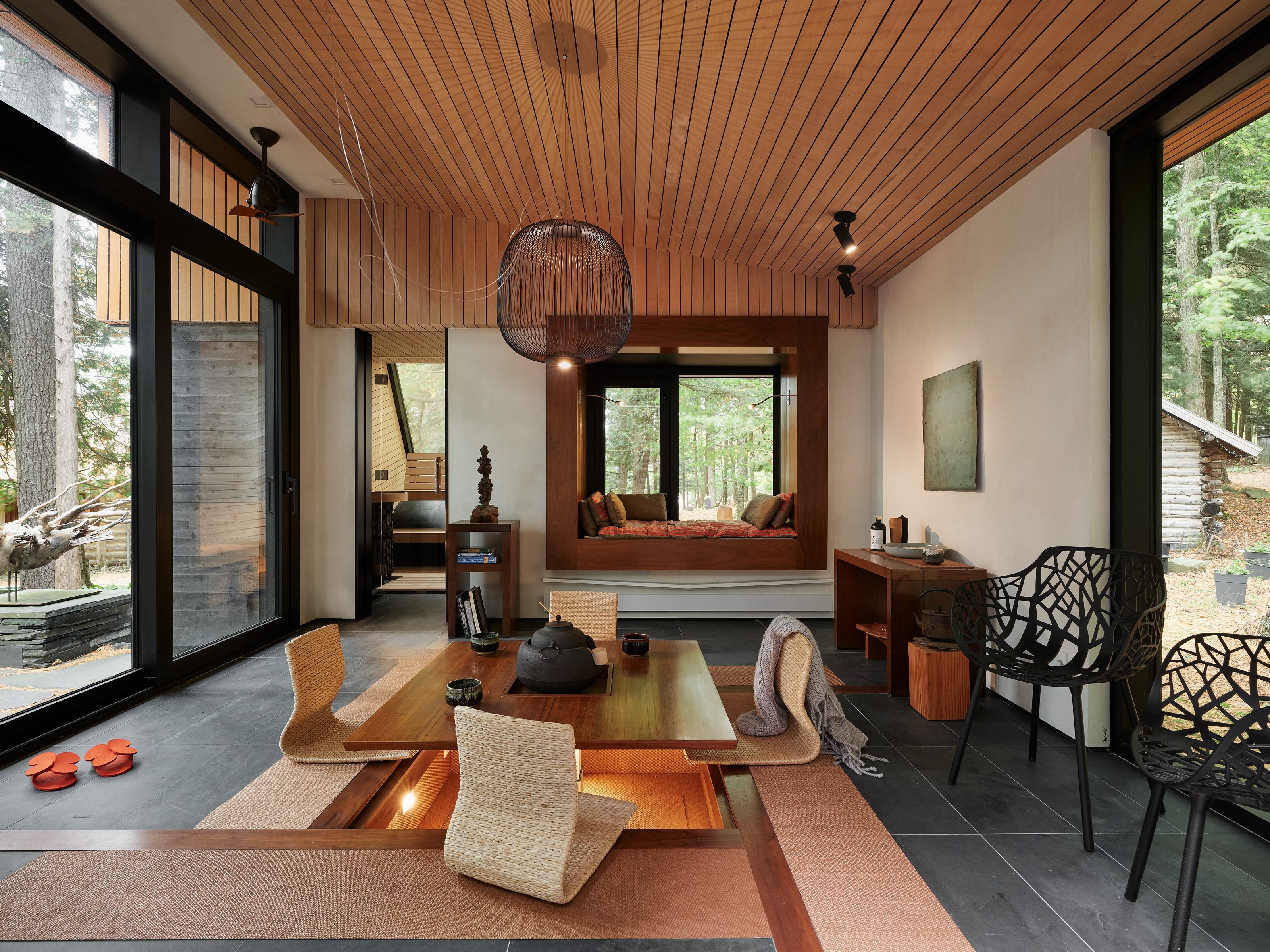 The Tokonoma, an alcove traditionally reserved for scrolls in Japanese architecture, is transformed into a generous bay window offering exceptional views of the natural surroundings, inviting contemplation and meditation.