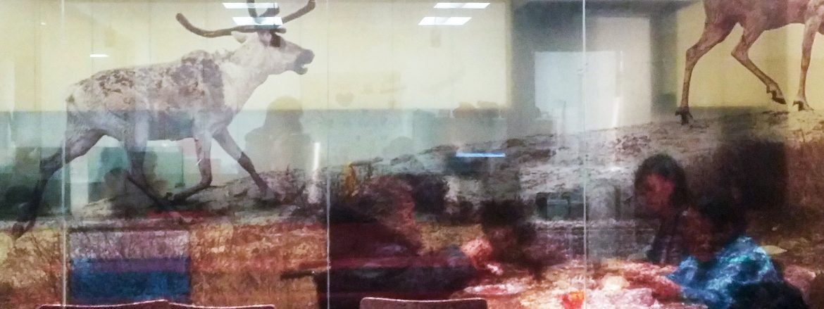 The picture is a photograph by Robert Frechette, general director of the Avataq Cultural Institute. It adorns the glass partition of the country food area of Ullivik.