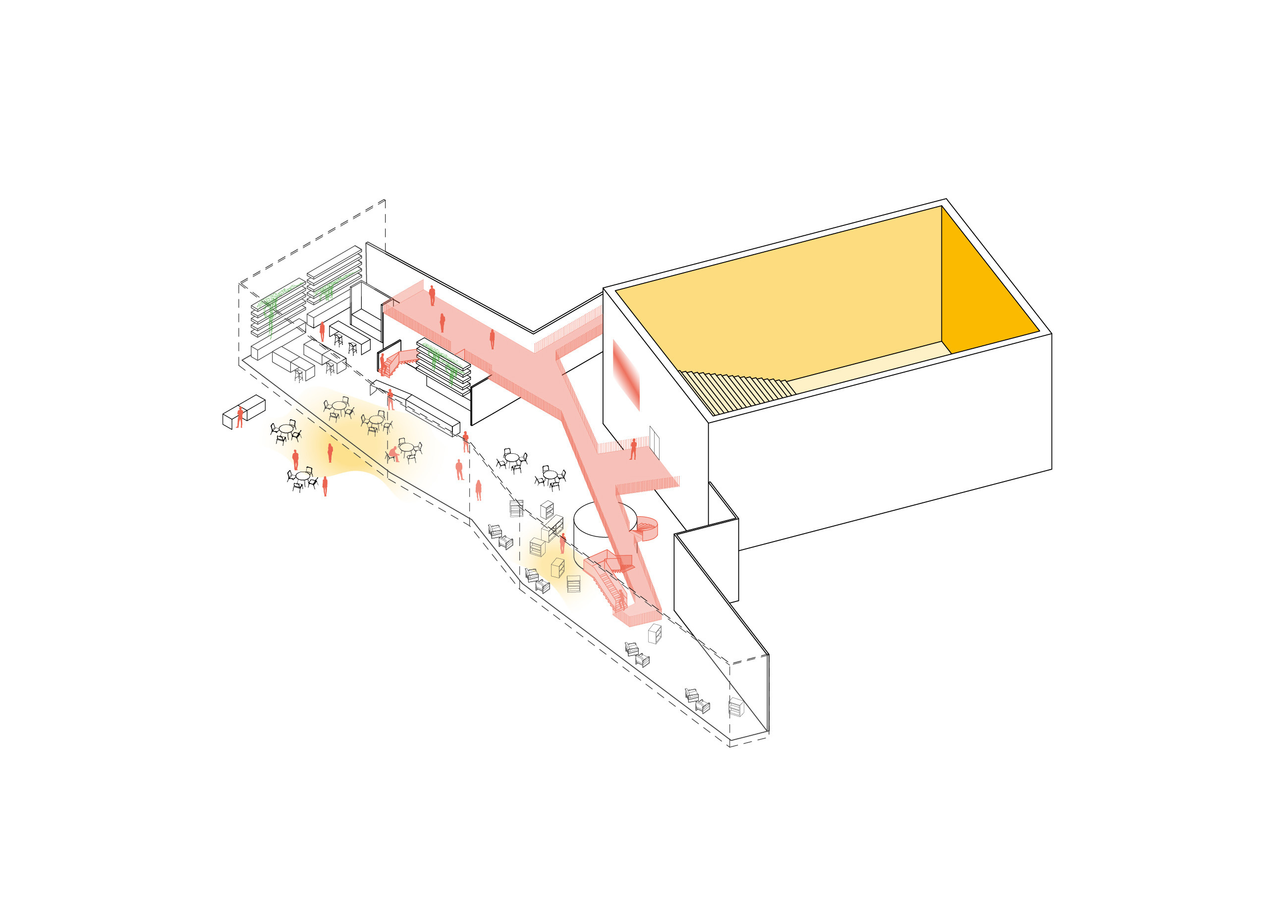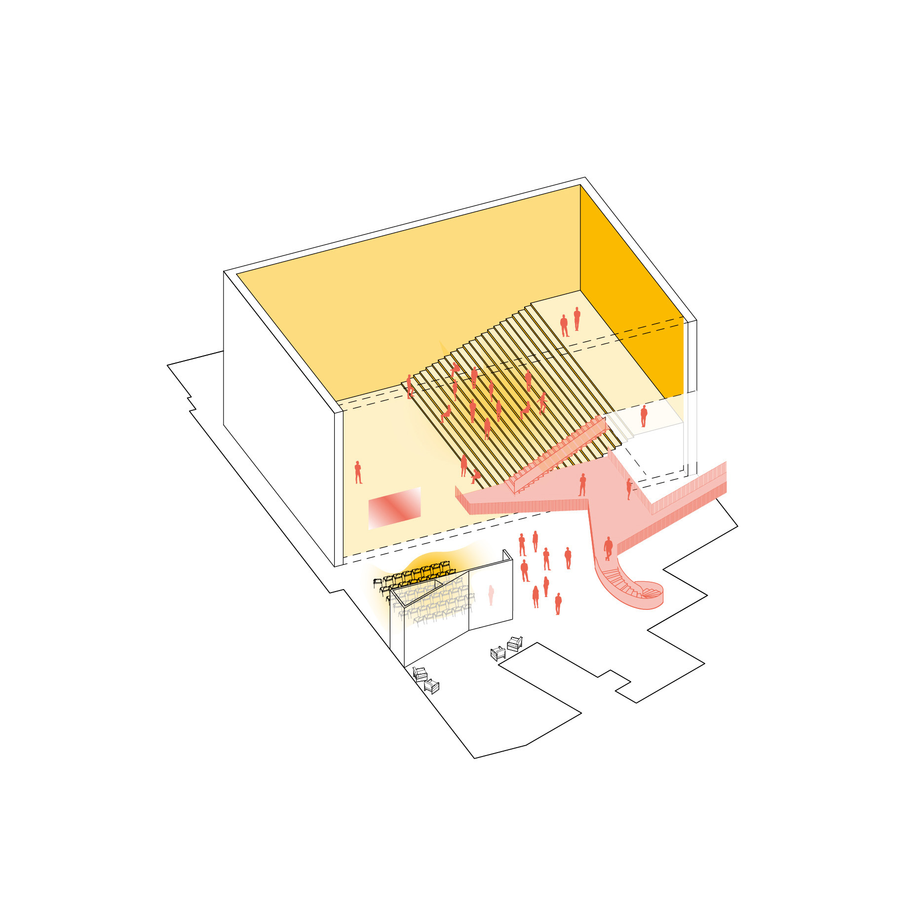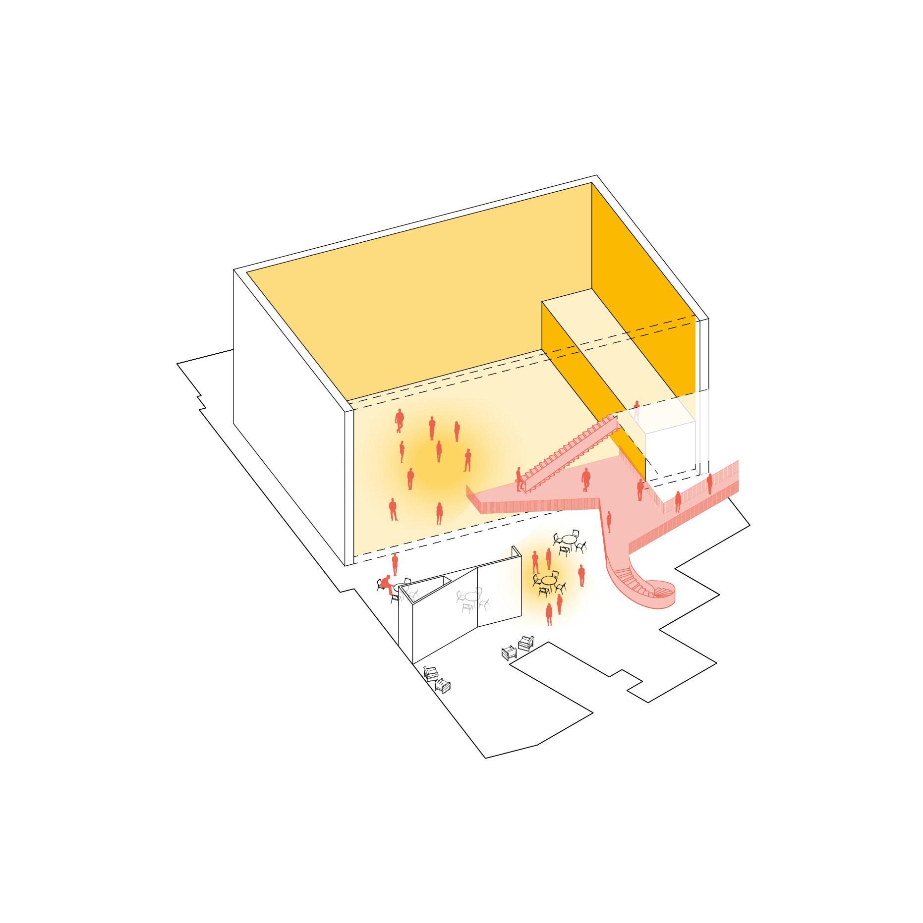 Several areas can be transformed to accommodate spontaneous or planned events. The balcony of the auditorium opens onto the main hall, accentuating its event-oriented character. Technical floors and grids in the ceiling of the hall and agora ensure maximum flexibility in its potential for appropriation.
