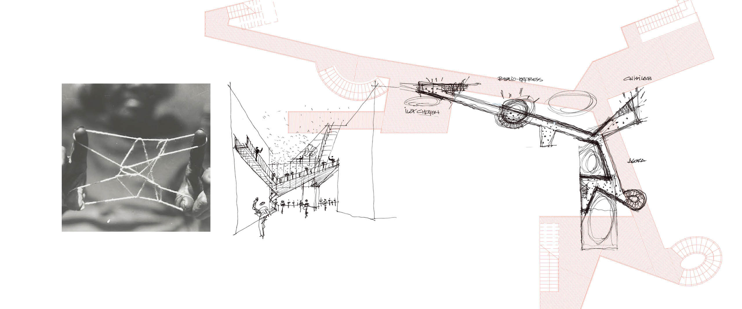 " These “activators” are linked and supported by the bridge _ AJARAAQ. Like the Inuit string games, this matrix is linked to language and communication. It is asserted by the simplicity of the material, at once expressive and evanescent; between presence and abstraction. It expresses an infinite wealth of configurations.