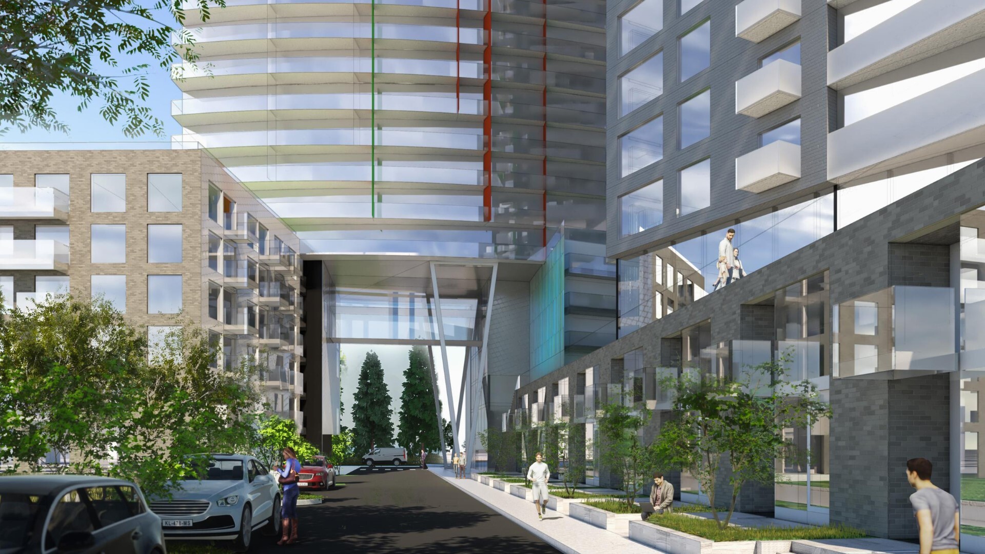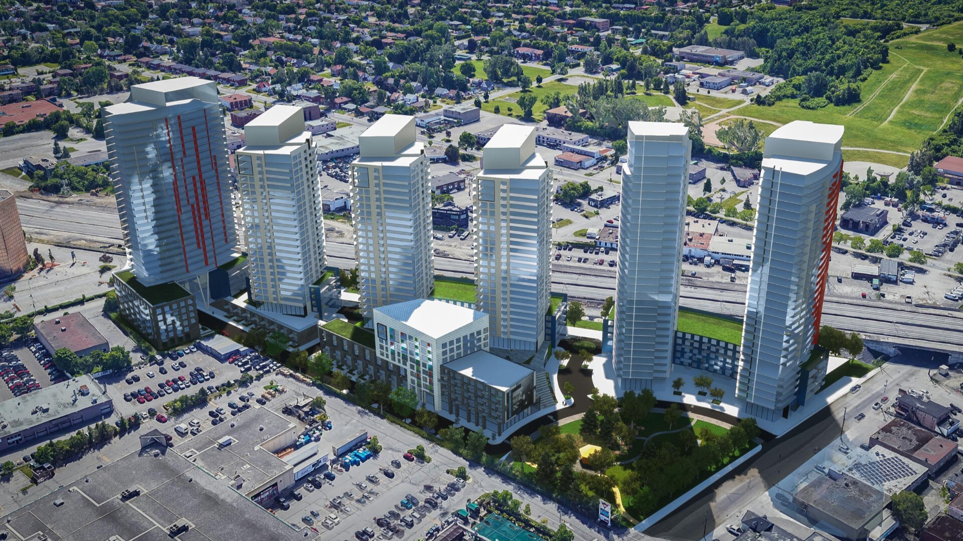 The project is modeled on the irregular 2.7-hectare site north of the Queensway in Ottawa, which offers the opportunity to create a densified buffer zone between the existing neighbourhood and future developments to the north - protecting them from the visual and acoustic impacts of the highway.