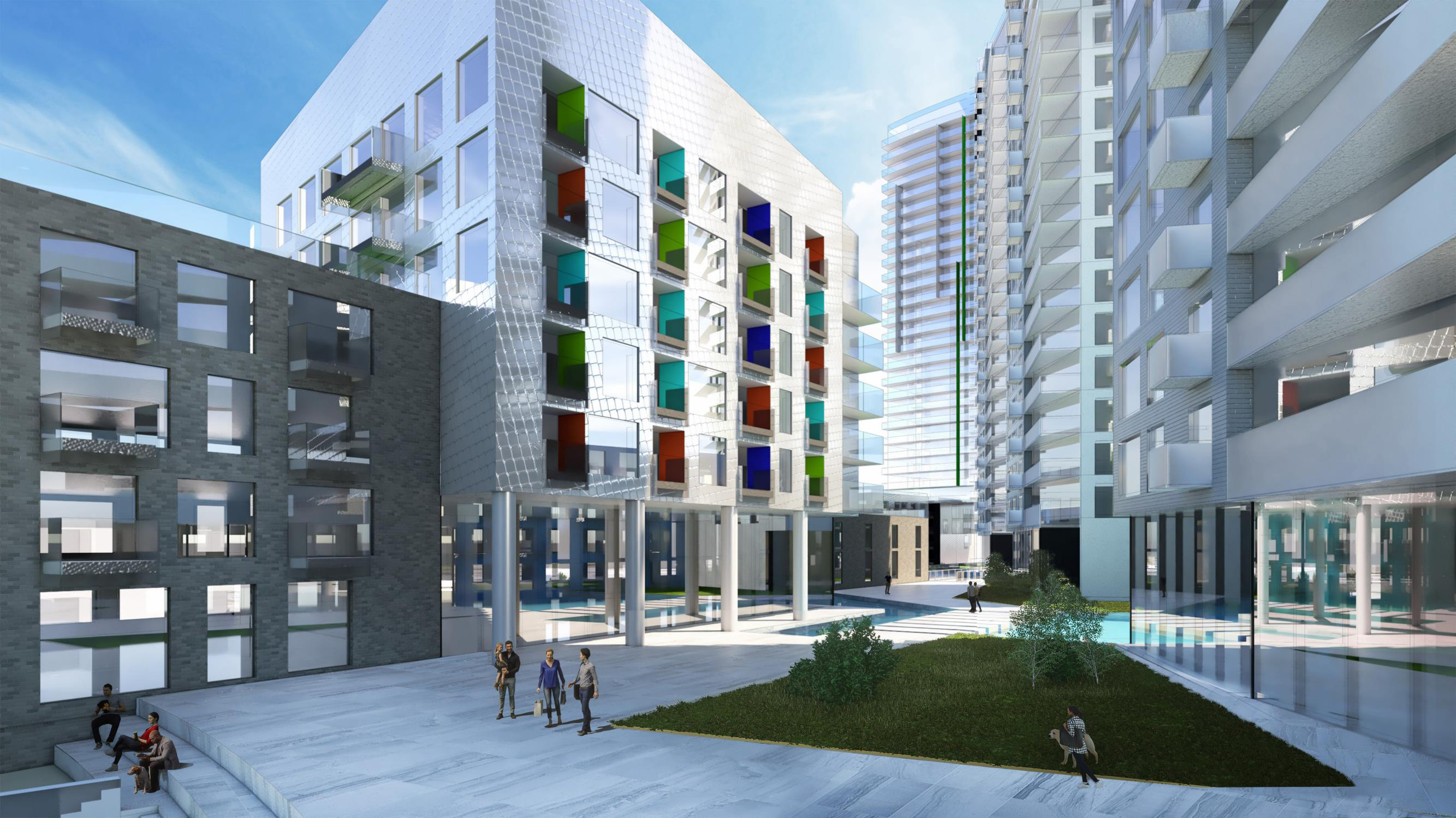 Outdoor environments are modulated using different levels, volumes and textures. Streets and open outdoor circulation areas are treated with amenities, lobbies, townhouse entrances and retail outlets featuring a variety of treatments and scales.