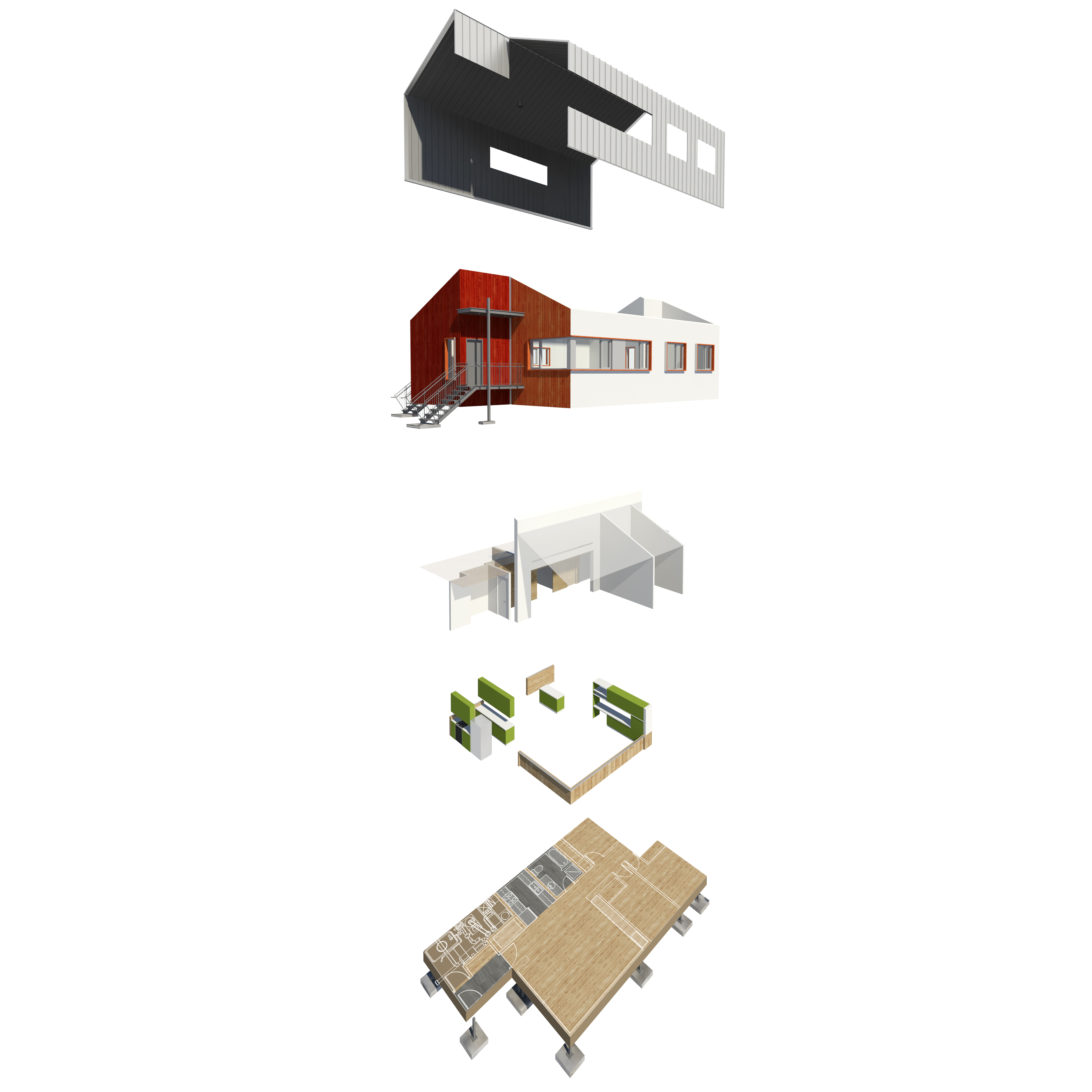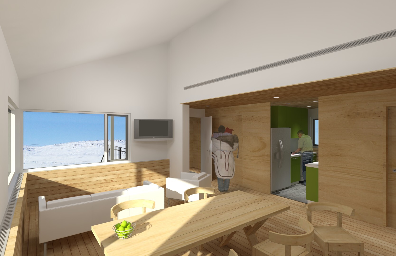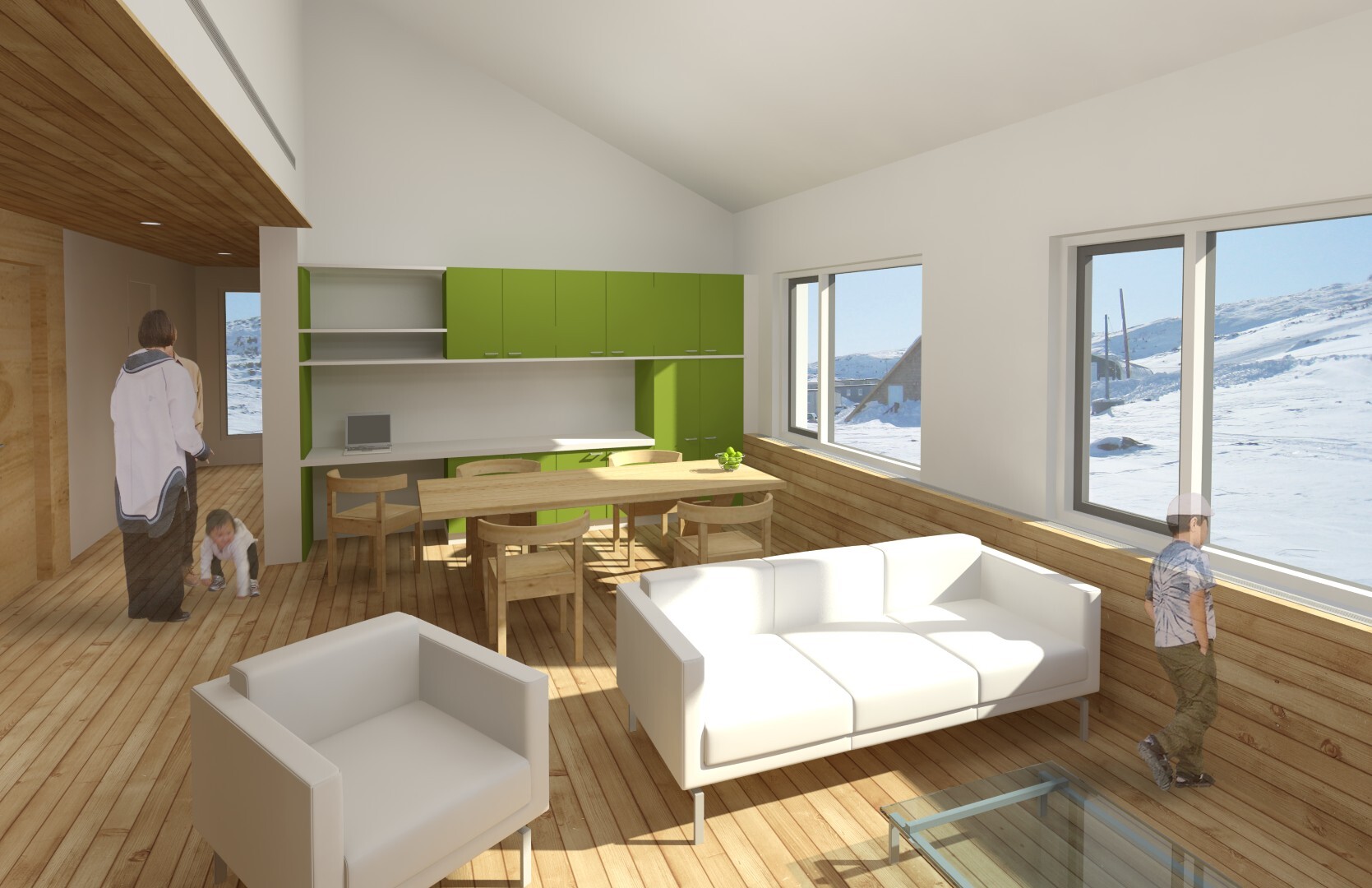 E-gloo 1000 was designed to respond to Nunavik's rigorous climate and the Nunavimmiut lifestyle. Its functional volume incorporates a canopy at the front to protect the entrance from the elements. Its compact floor plan, centred on a luminous living room with a cathedral ceiling, provides a fluid circulation to the other rooms. The opening windows in each space provide natural cross-ventilation and optimise occupant comfort. Several types of storage and a choice of exterior cladding colours allow occupants to personalise their spaces to suit their needs.