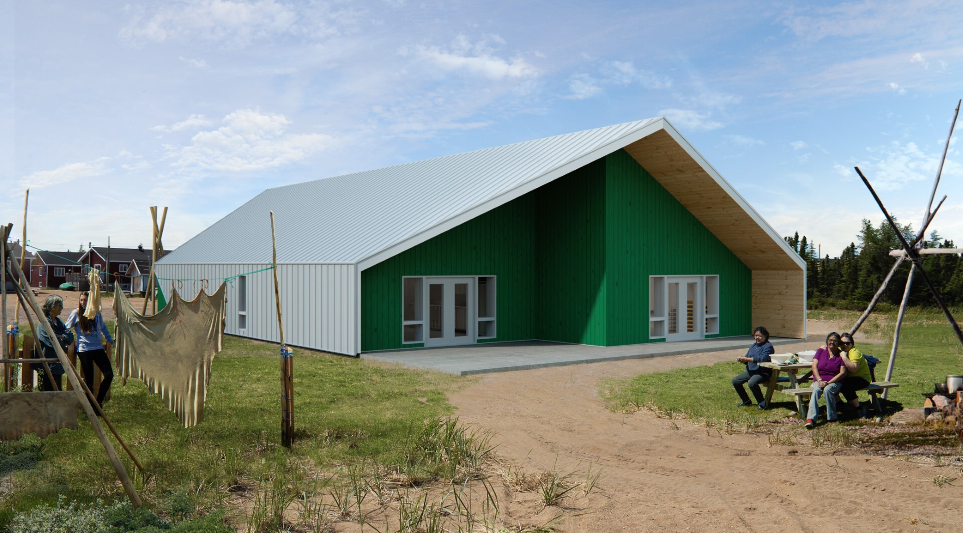 Located in the heart of the Innu community of Ekuanitshit, the Eshikatiut Tshukuminu Innu-Natukuna Pavilion was designed to provide permanent accommodation for two community organizations offering programs dedicated to the women of Ekuanitshit. Through a collaborative process involving public consultations and a series of meetings, the building’s program, plan and design were developed collaboratively with the community and members of the two groups that will occupy it.