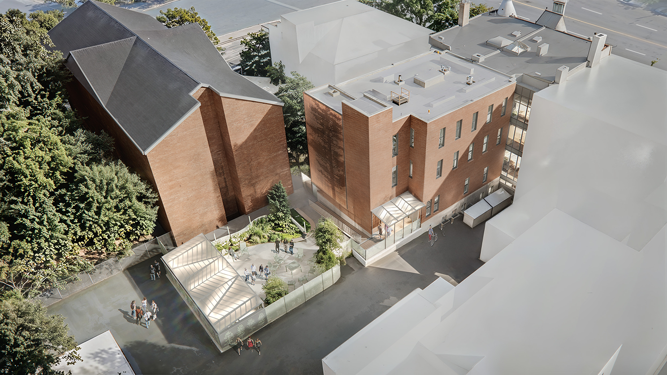The project’s back garden offers an oasis of peace to occupants amid the hustle and bustle of the city. Activities and access points are oriented to this space, with the addition’s new vertical circulation core, clad with a second skin of backlit perforated metal panels, bearing the image of a large pine tree, evoking peace, and affirming the presence and place for the community—a symbolic lantern for the neighborhood.