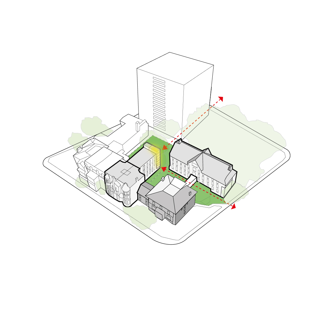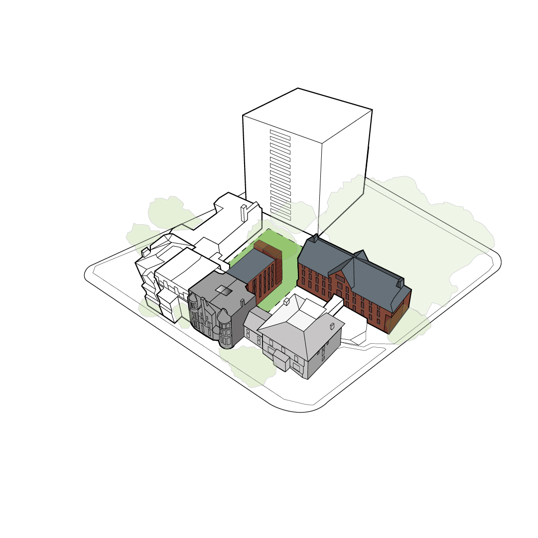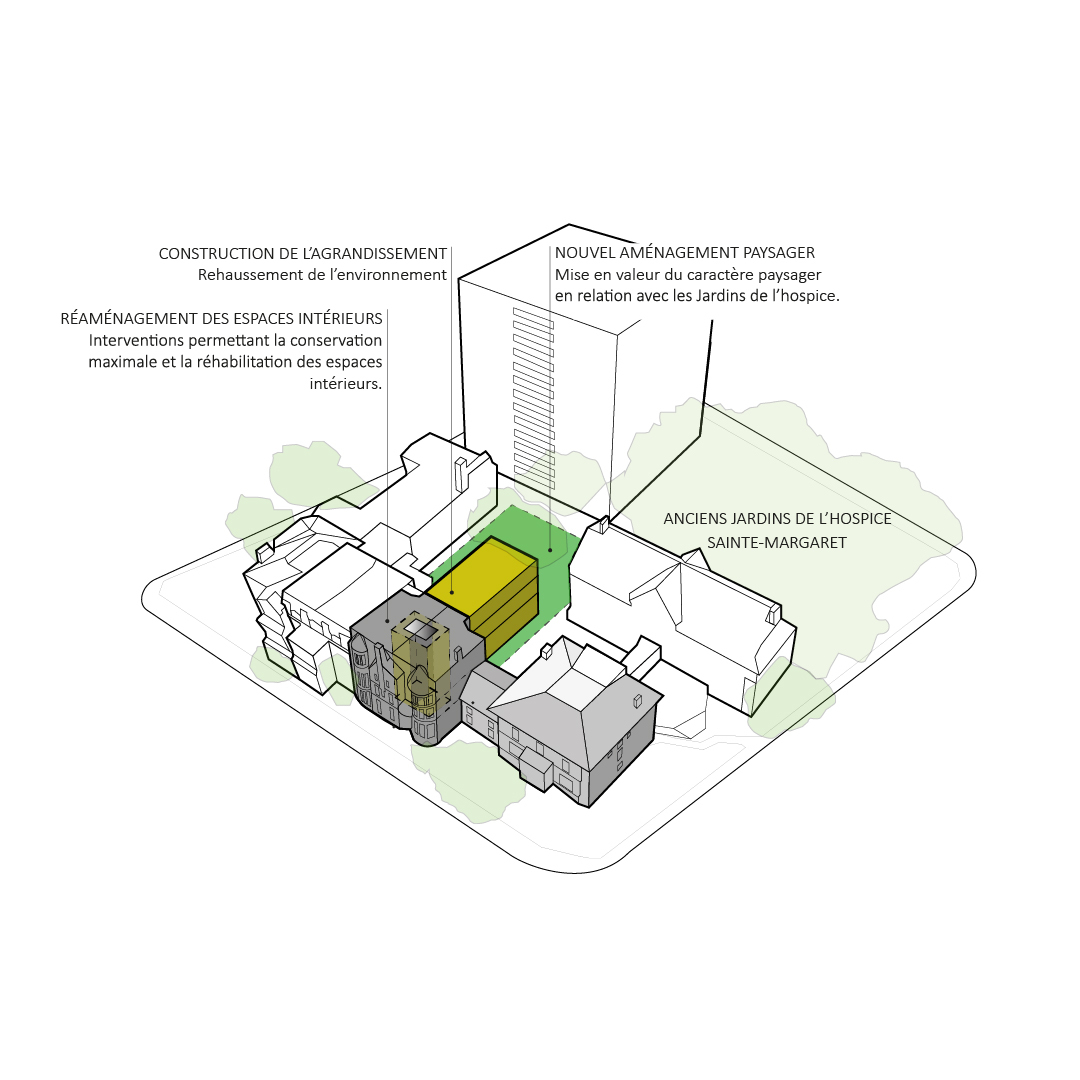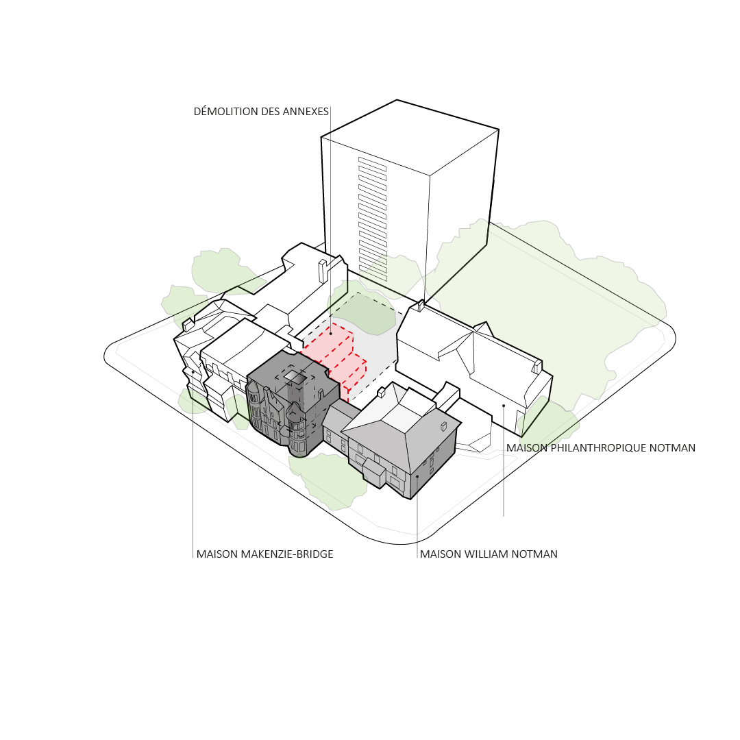 Following their acquisition of two existing buildings of heritage interest on Sherbrooke Street in downtown Montreal, Projets Autochtones du Québec (PAQ) commissioned EVOQ Architecture to assist them in developing an emergency shelter project for First Nations, Inuit, and Métis clients in precarious housing situations. The project includes rehabilitating the existing buildings and incorporating a new 3-story addition, which together provide housing and amenities designed with sensitivity to the unique needs of its new occupants, all guided by a vision of integration and respect for heritage and the environment.