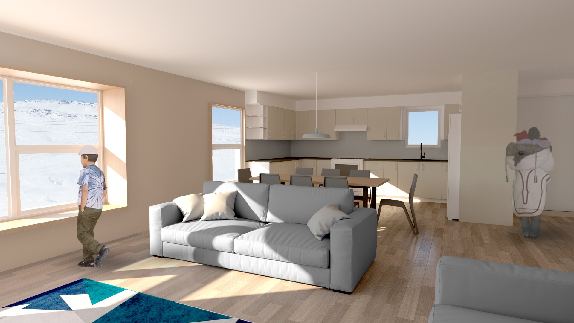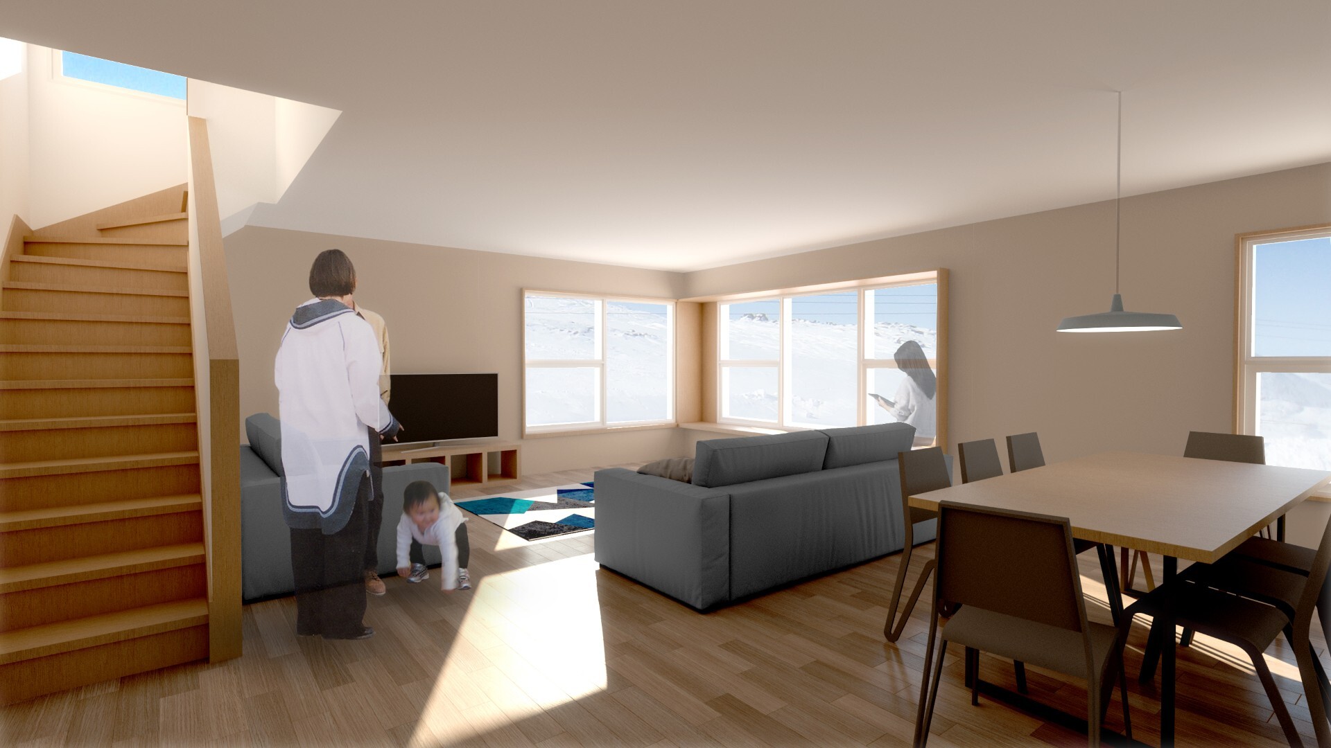 In 2022, EVOQ designed the first Makivvik single-family, 4-bedroom model (called S4). This model was developed in co-creation with Makivvik's Director of Construction Division, Frédéric Gagné, to meet the current wishes of Nunavimmiut. Measuring 216 m2 over 2 floors, this model offers bright, spacious interiors.