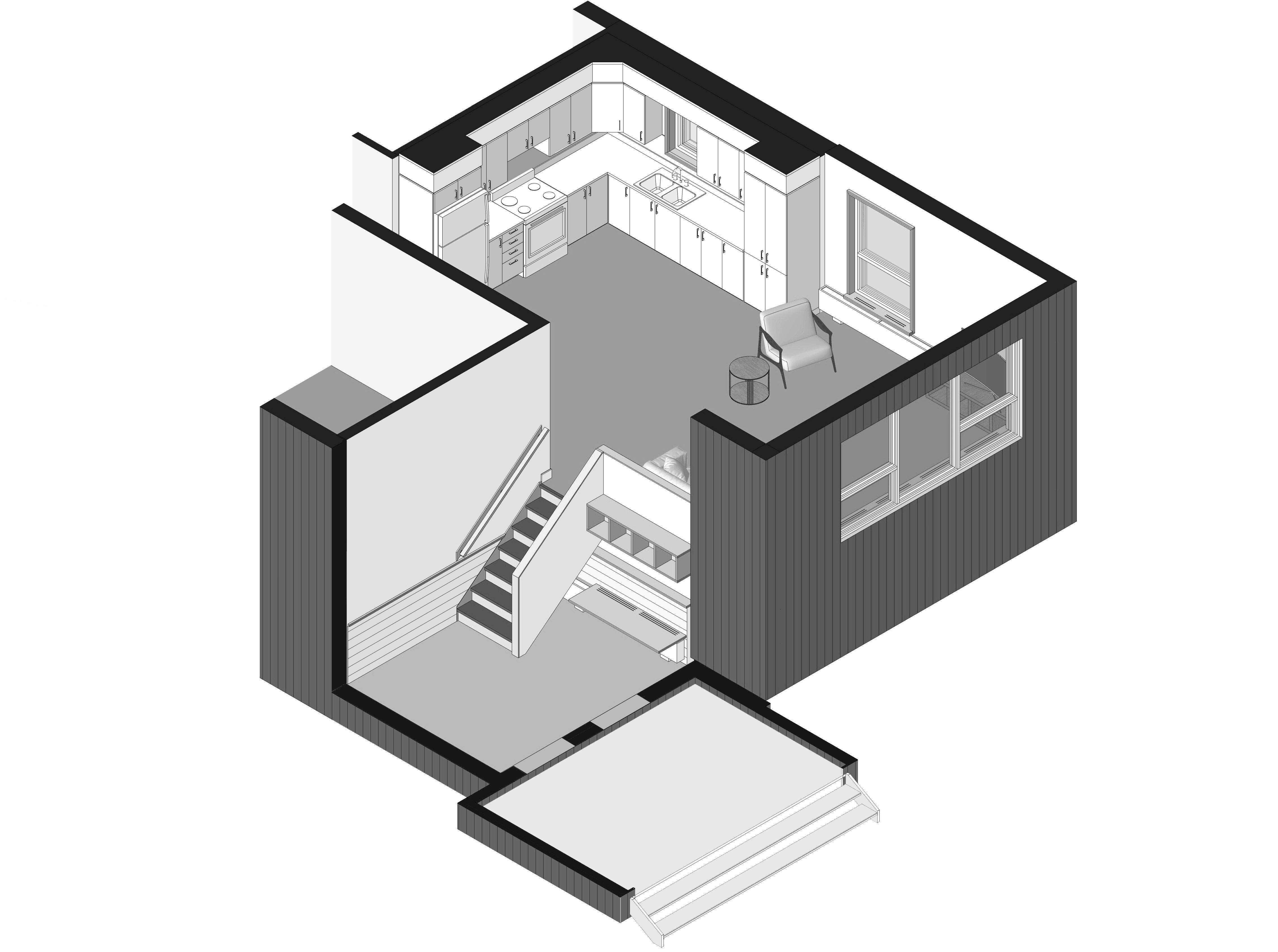 The following year, a similar 3-bedroom model was developed. One of the major optimizations was the integration of an entrance vestibule at the same level as the crawl space—i.e., very close to the ground—to reduce the number of steps required to access the house.