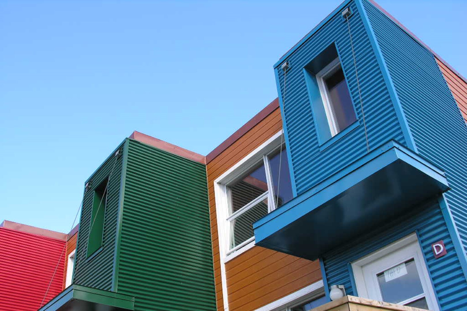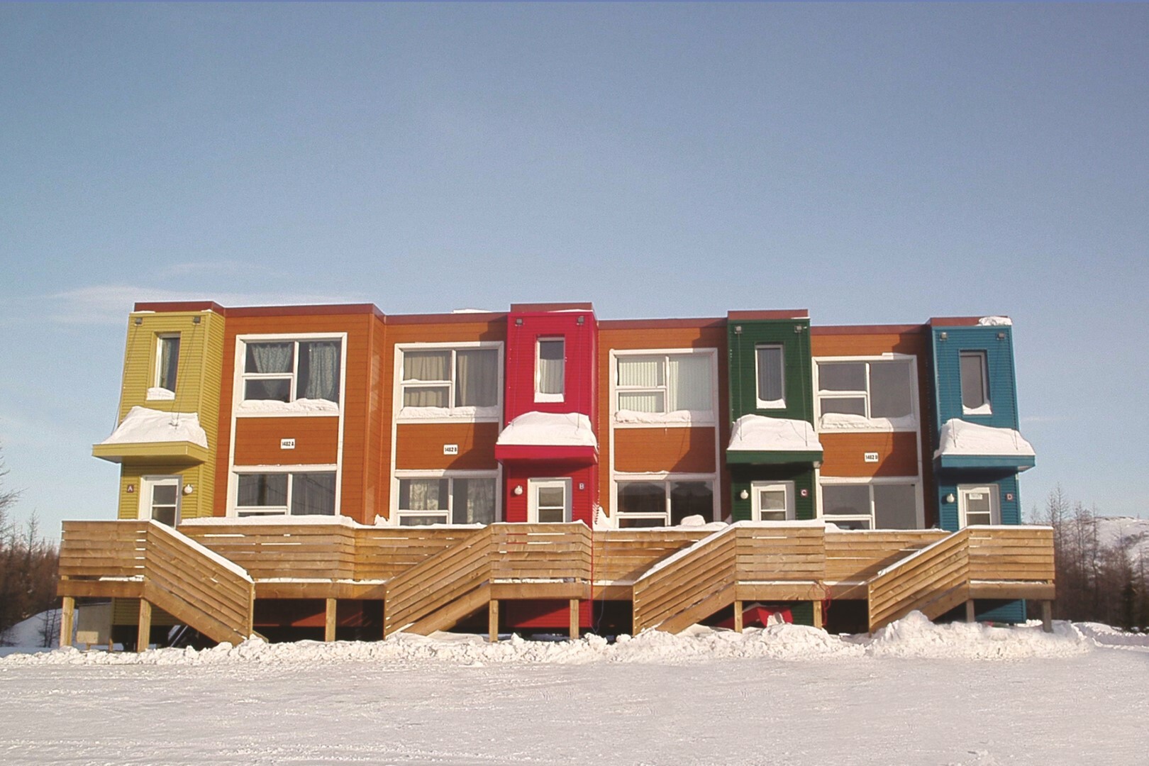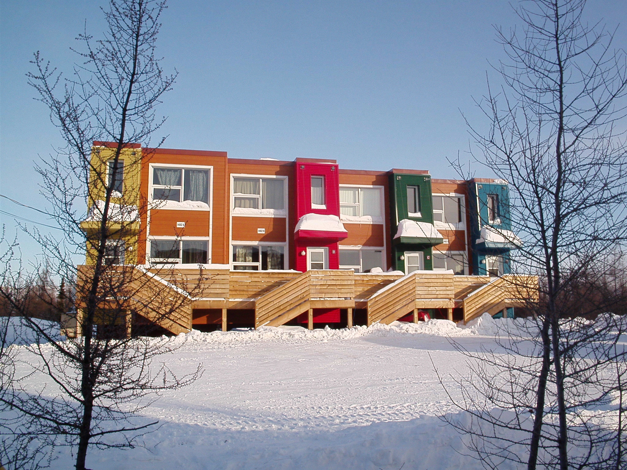 In order to address the chronic housing shortage while limiting sprawl in Nunavik communities, the KRG sought to develop efficient high density housing units. Panaq designed a fourplex modeled on the rowhouse typology.