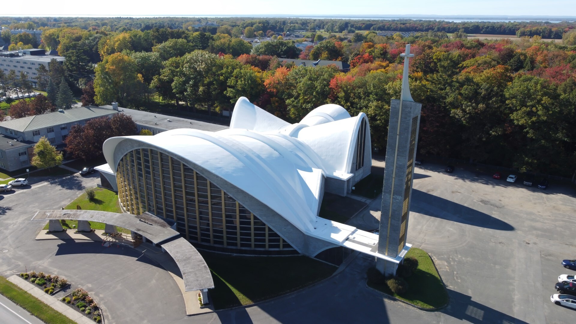 Saint Jean-Baptiste Cathedral is a significant building in the context of Quebec’s modern religious heritage. Designated as a key reference in Quebec’s inventory of places of worship, it was designed by Canadian architect Gérard Malouin and completed in 1963. The building is notable for its large stained-glass windows and its monumental expressionist arched dome roof structure, one of the earliest examples of its kind in Canada.