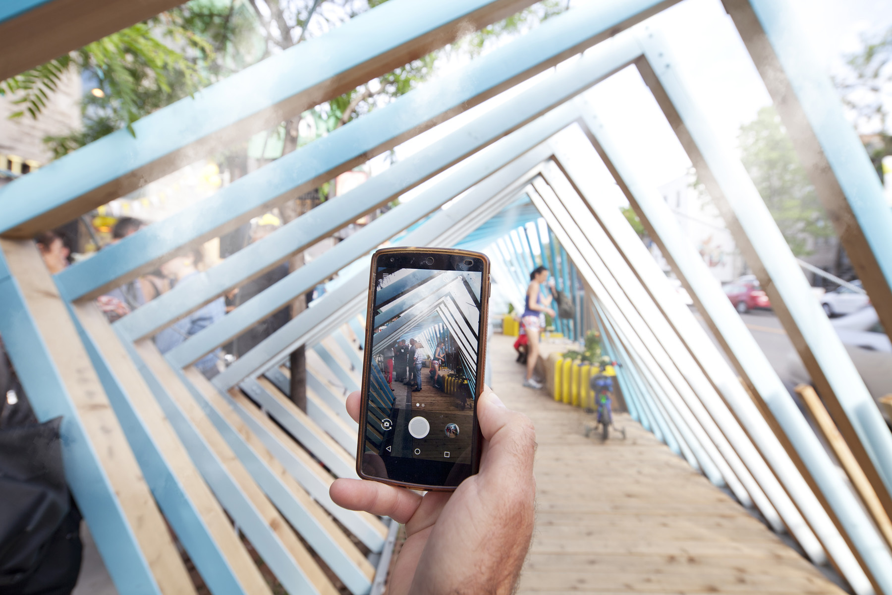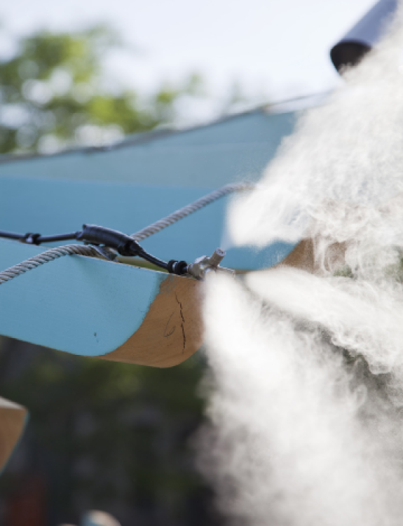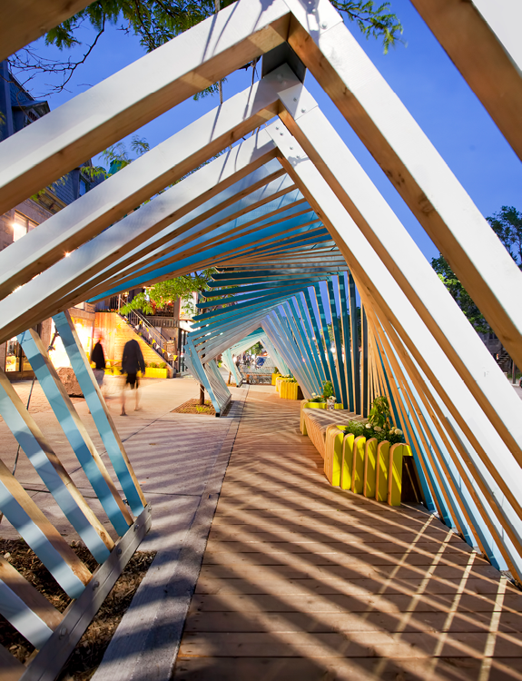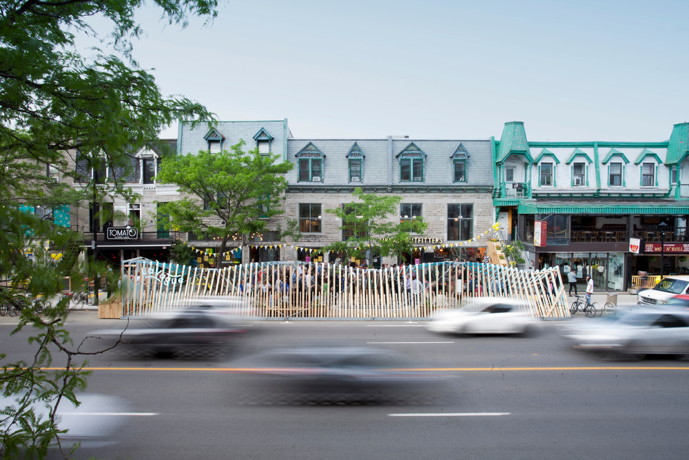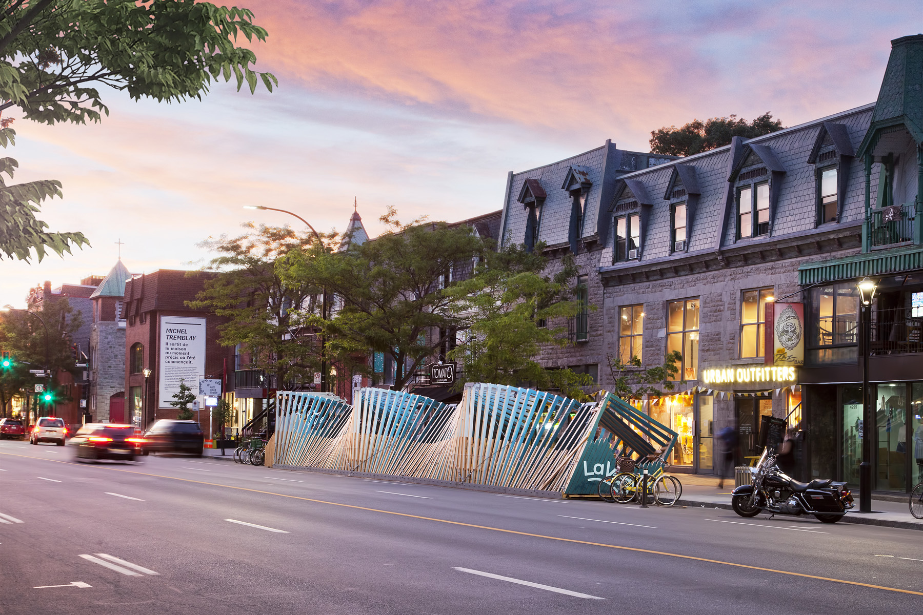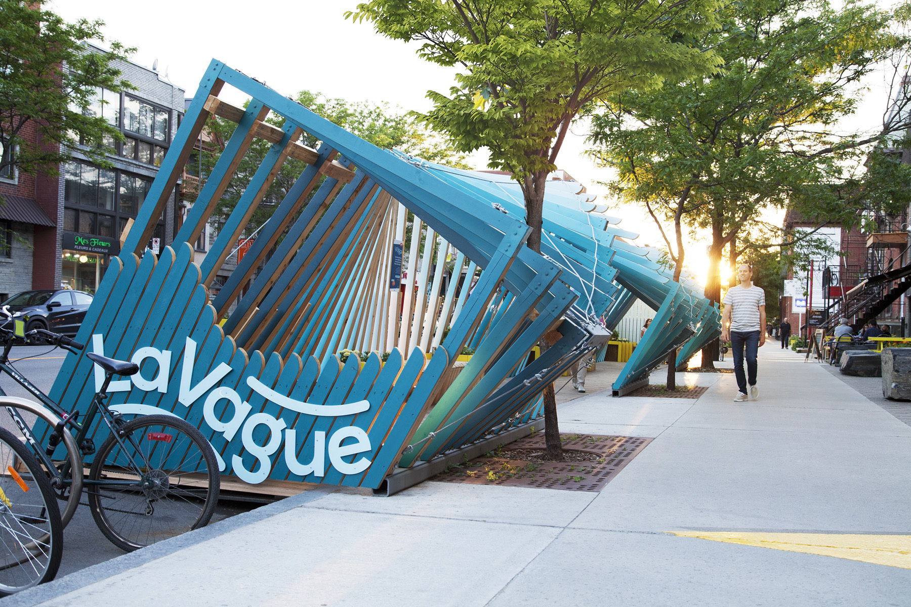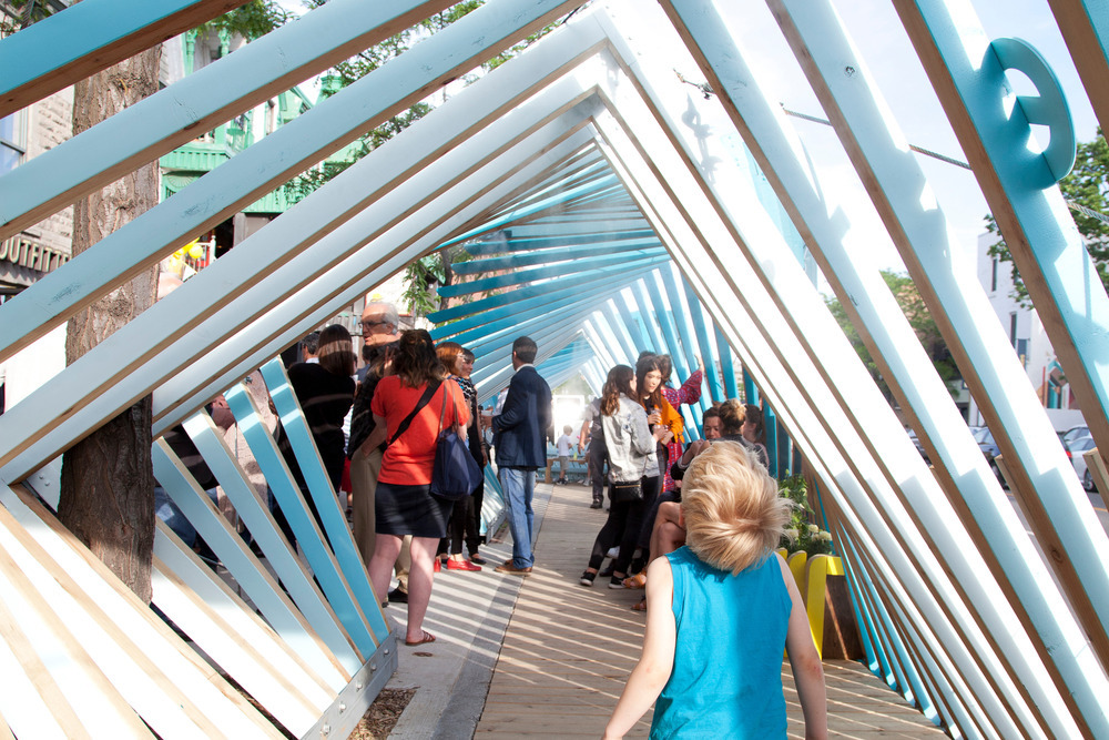 Replacing five parking spaces, The Wave (La Vague) was a temporary installation that extended a section of sidewalk along St-Denis Street to create a fun spot for socializing or taking a break. 74 wooden frames painted in various shades of blue were laid out to evoke a wave pattern and then inlaid with 45 user-activated misters to create a refreshing summer escape in the heart of downtown Montreal!