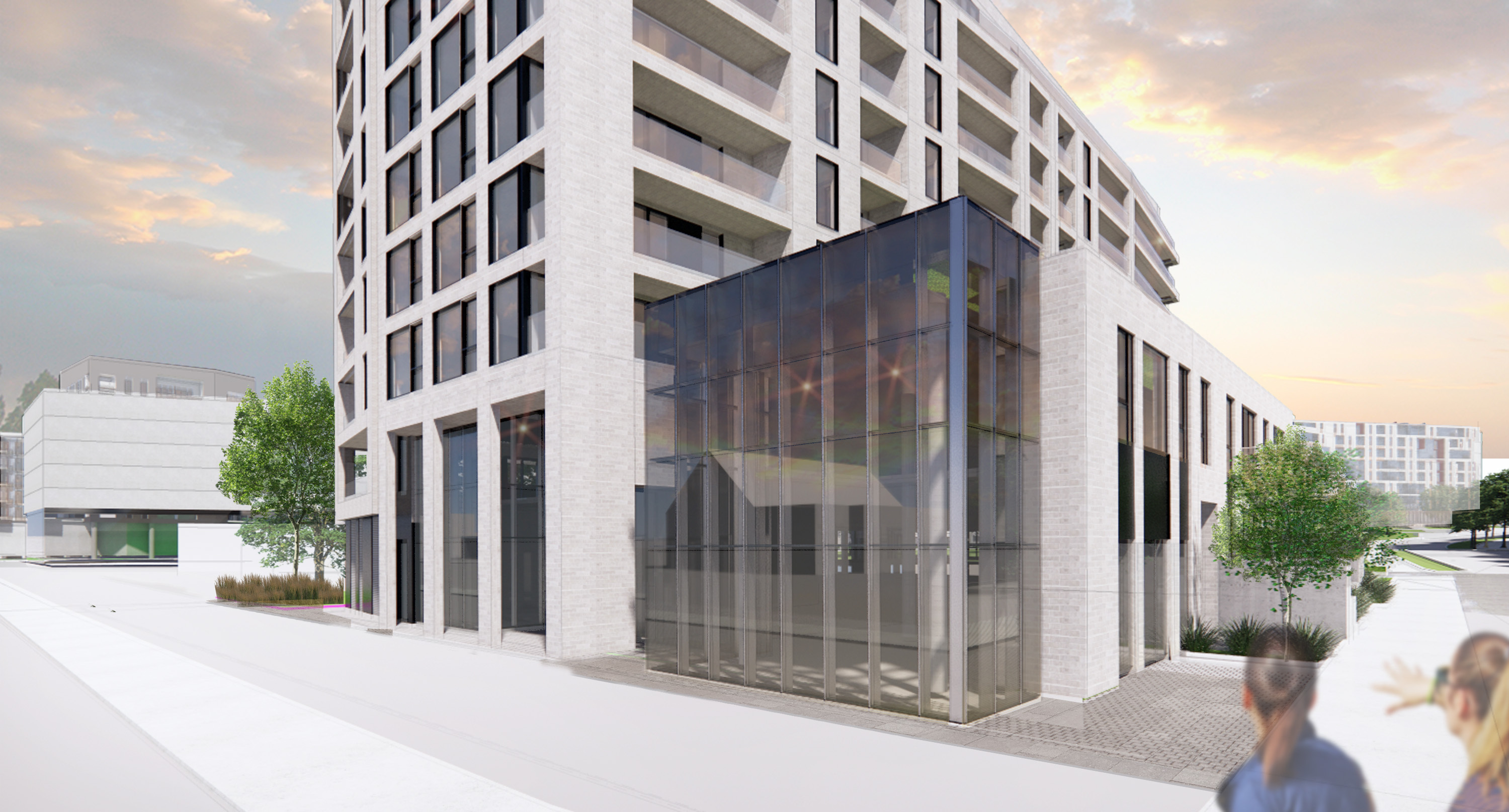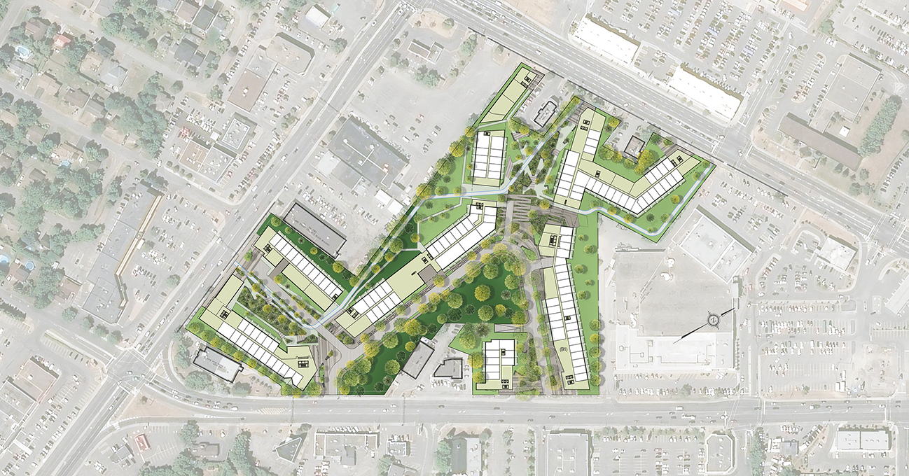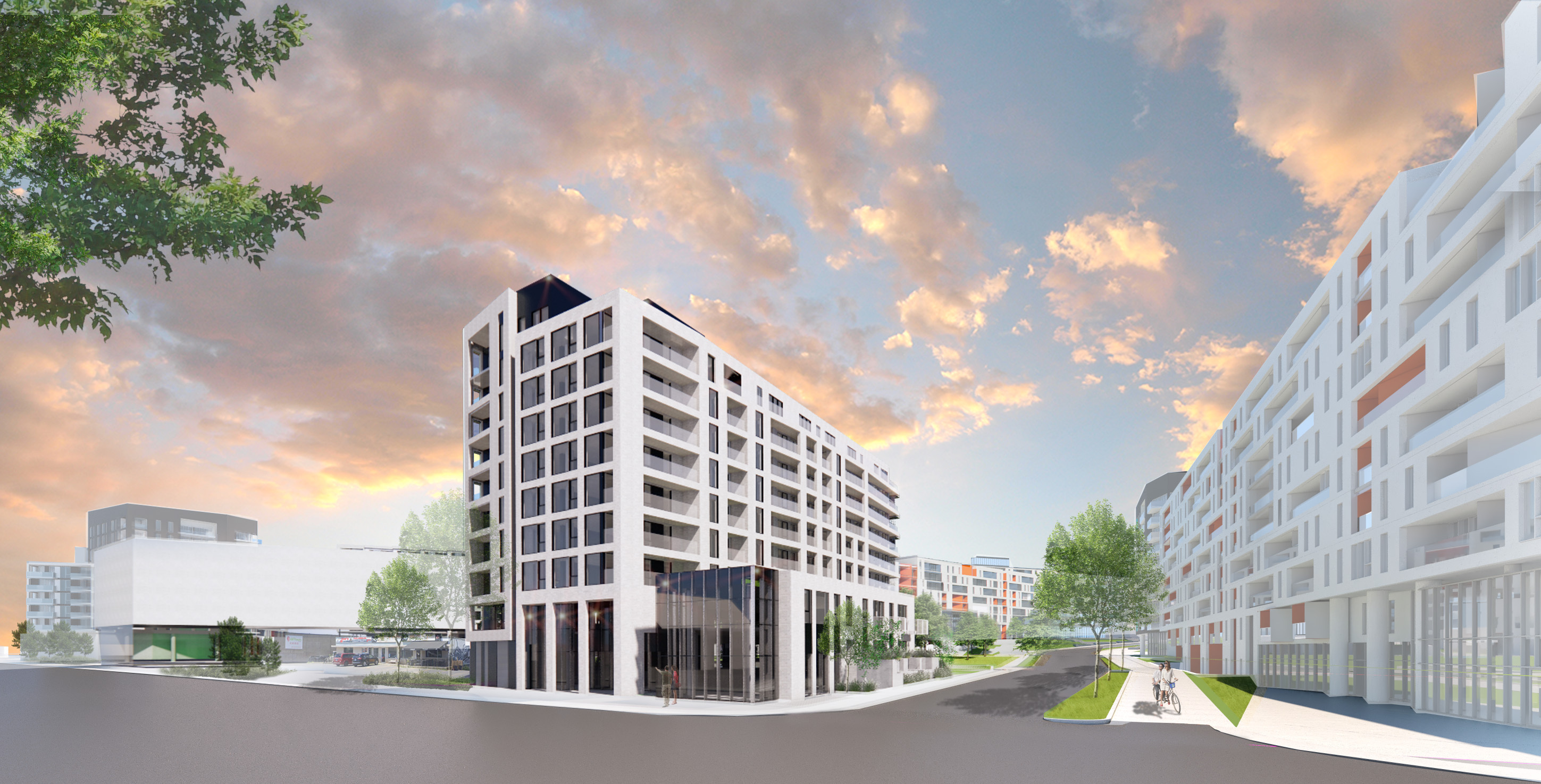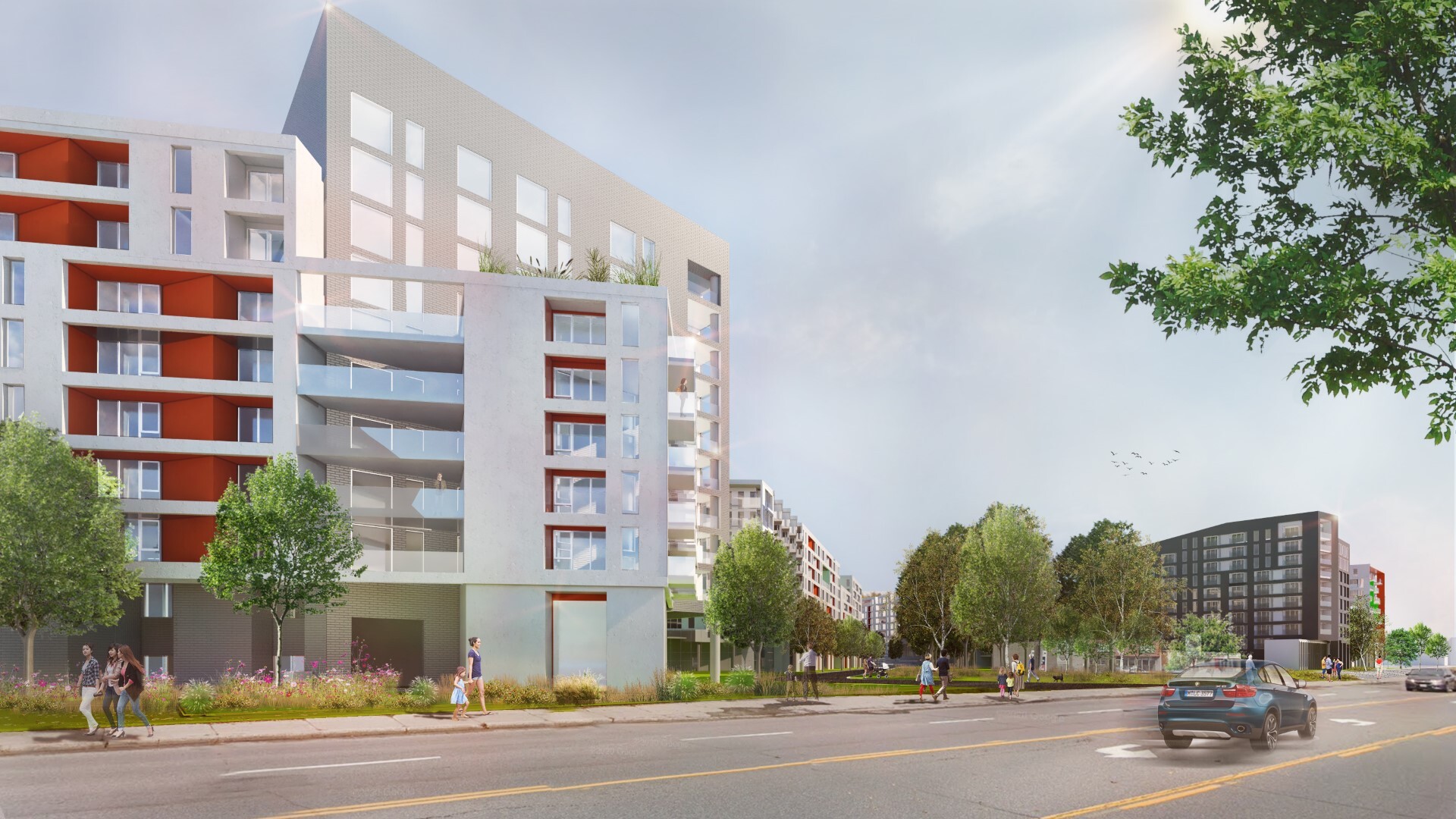 Environné par des zones commerciales et des quartiers résidentiels composés de maisons unifamiliales, le projet propose un développement résidentiel de hauteur moyenne avec des espaces commerciaux limités, principalement destinés aux résidents. Il redéfinit le quartier en offrant une structure nouvelle, favorisant la densification résidentielle dans une zone commerciale.