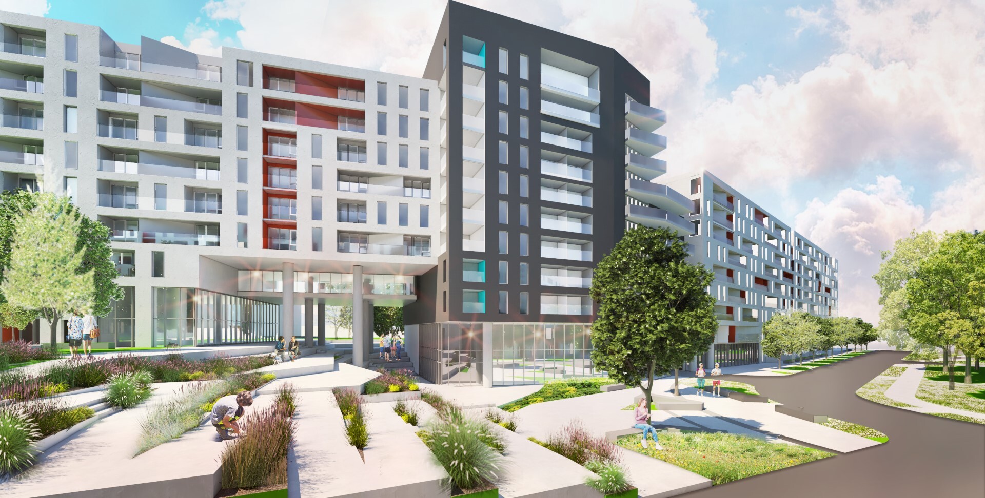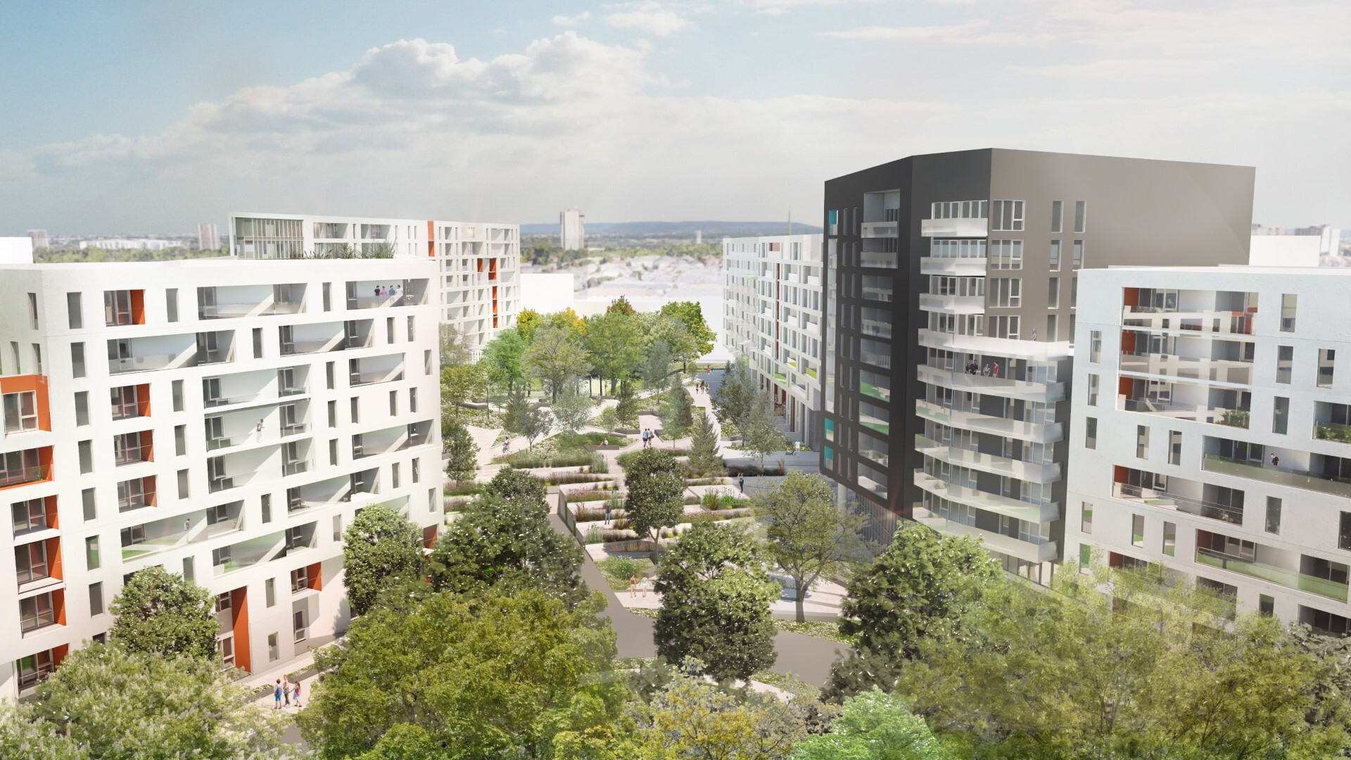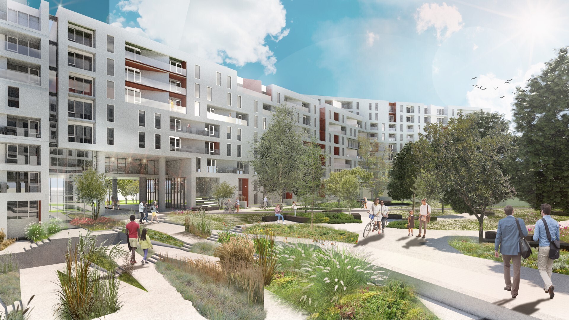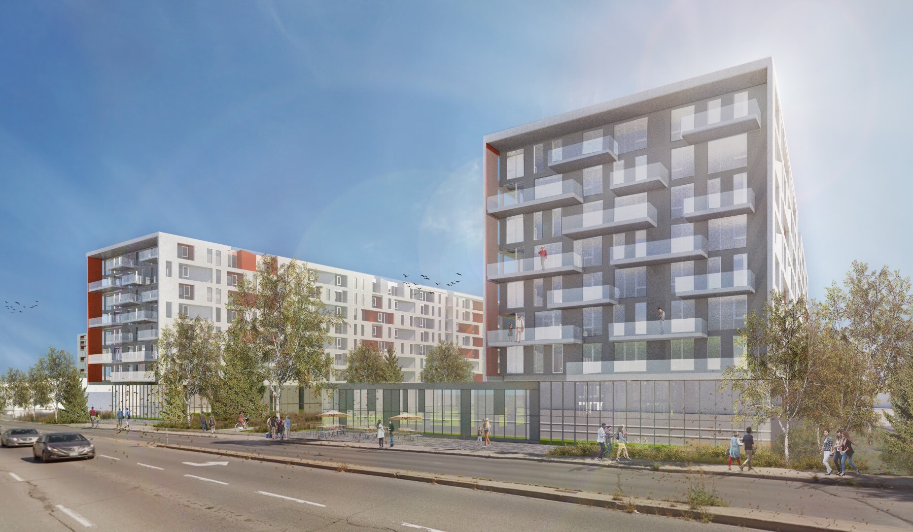 Les bâtiments serpentent à travers le site et se terminent sur les grandes artères, créant des portails d’entrée visibles. Des volumes plus hauts ponctuent les façades, tandis que des portes cochères au rez-de-chaussée facilitent la connexion entre les espaces publics et la circulation piétonne et cyclable.