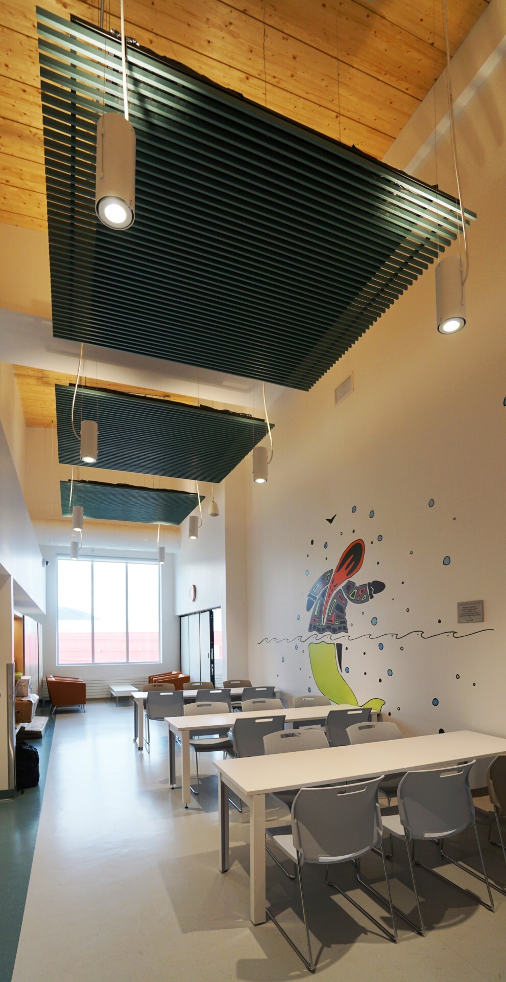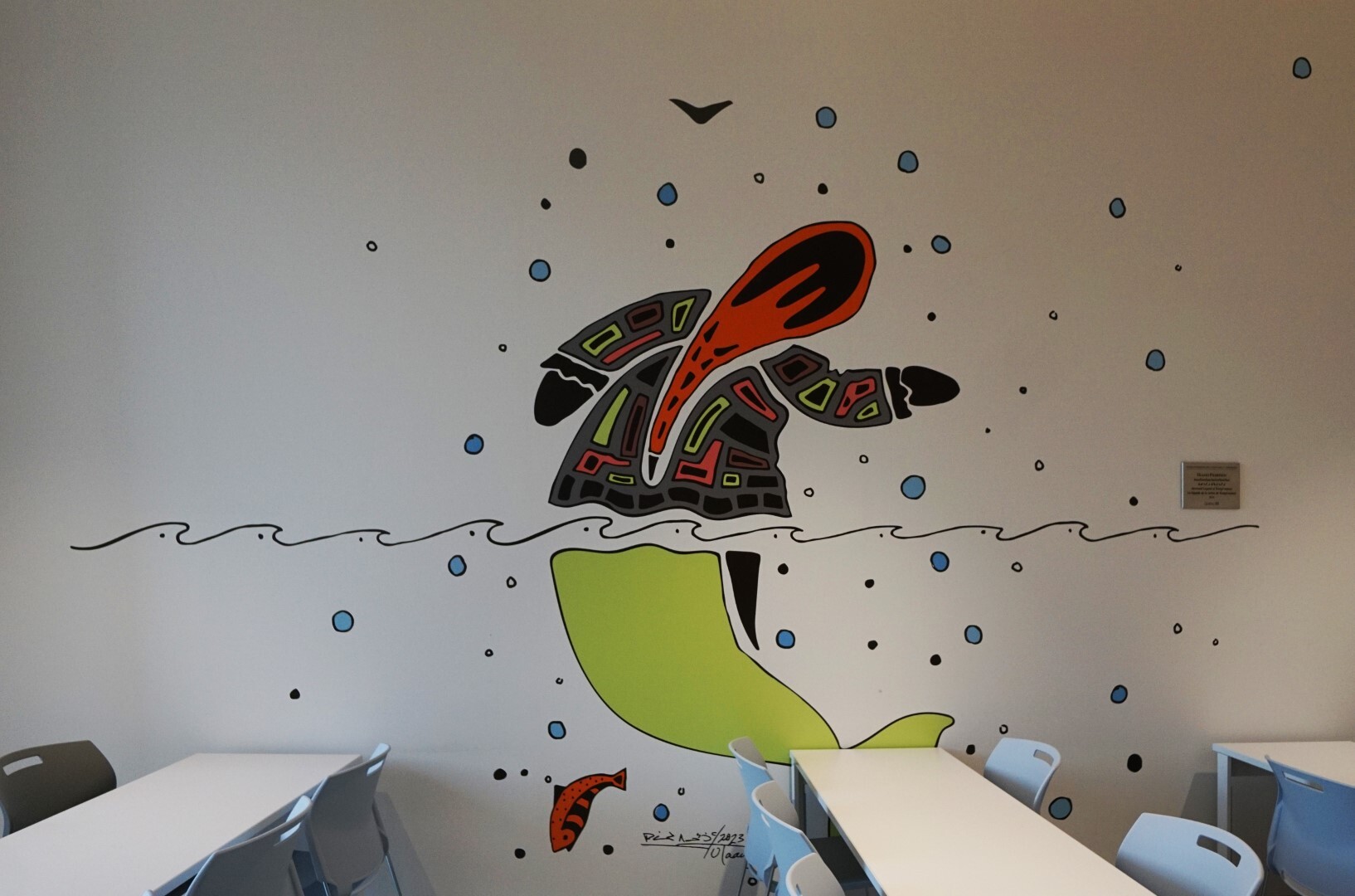 Inspirée par la cueillette de moules sous la glace, l'œuvre d'art dans la salle de détente s'intitule « La légende de la sirène de Kangiqsujuaq », réalisée par Ulaayu Pilurtuut.