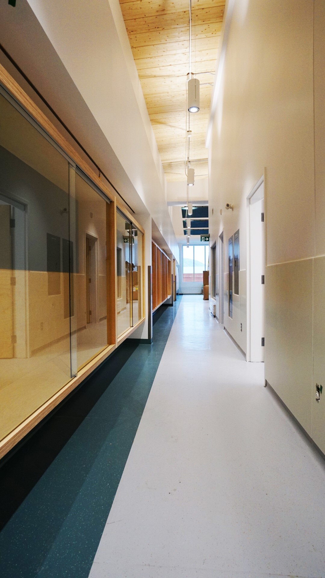 L'agrandissement, surbaissé de 1,8 mètre, relie la résidence au centre par un escalier et son remblai granulaire le rend assimilable à un étage unique, évitant l’installation de gicleurs. L’aménagement intérieur suit une épine dorsale centrale, élargie à l’aire de détente. La volumétrie s'inspire des lignes architecturales du bâtiment existant tout en réinterprétant le paysage montagneux environnant.