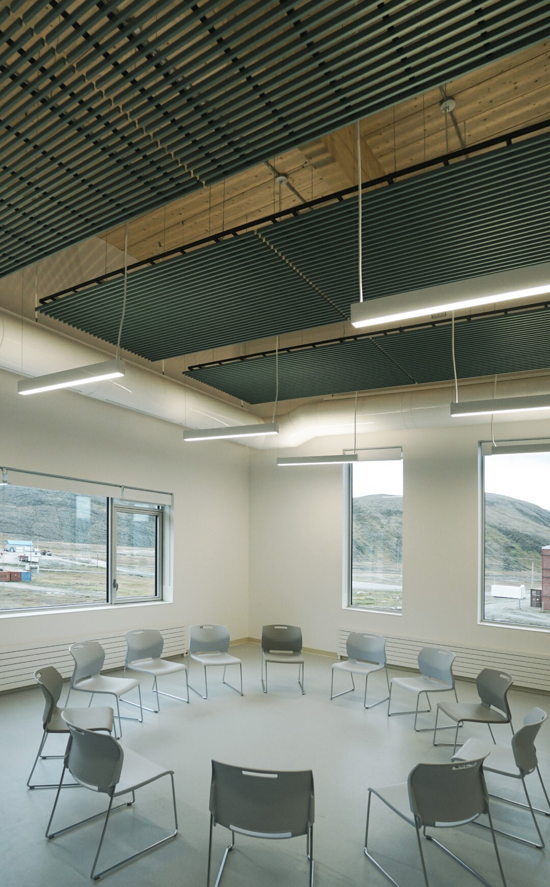 La résidence Nassivik de Kangiqsujuaq est un lieu d’enseignement pour les jeunes adultes de la communauté. En réponse à un déficit d’espace, la commission scolaire Kativik Ilisarniliriniq a confié à EVOQ l’agrandissement du bâtiment, ajoutant quatre salles de classe précollégiales, une aire de détente, des bureaux administratifs et une salle de réunion. L’orientation des espaces optimise l'éclairage naturel tout au long de l'année.