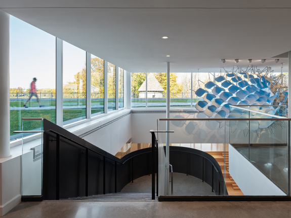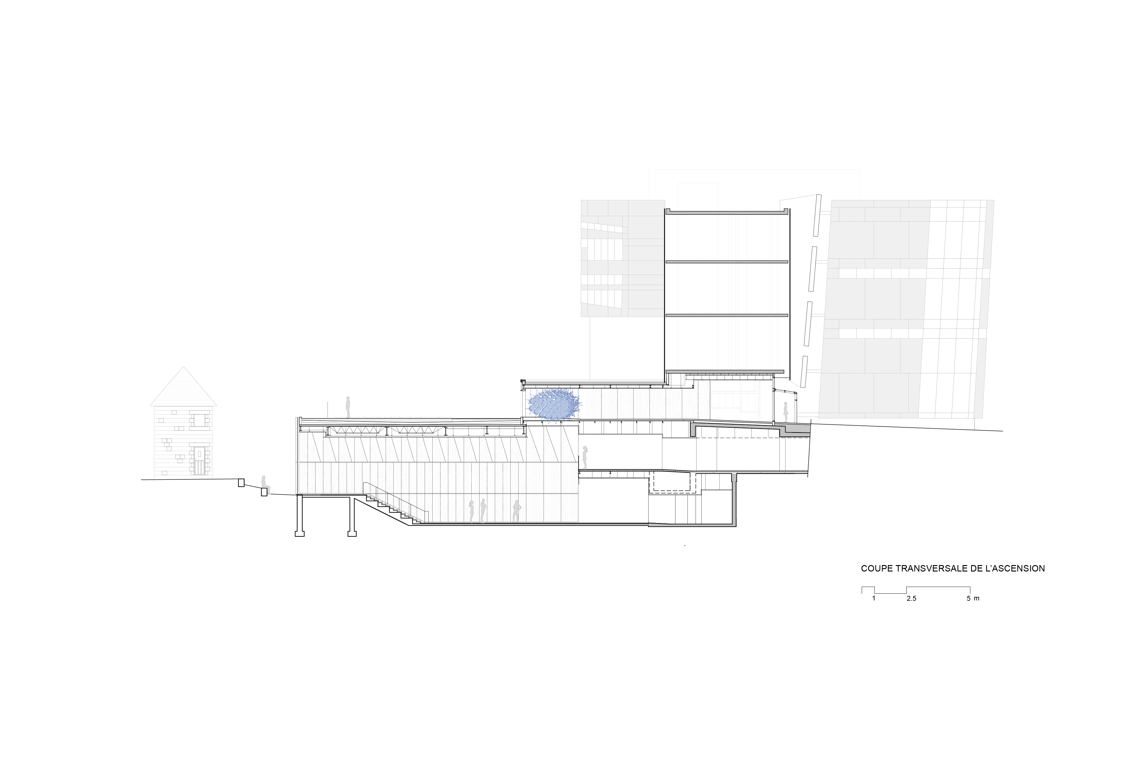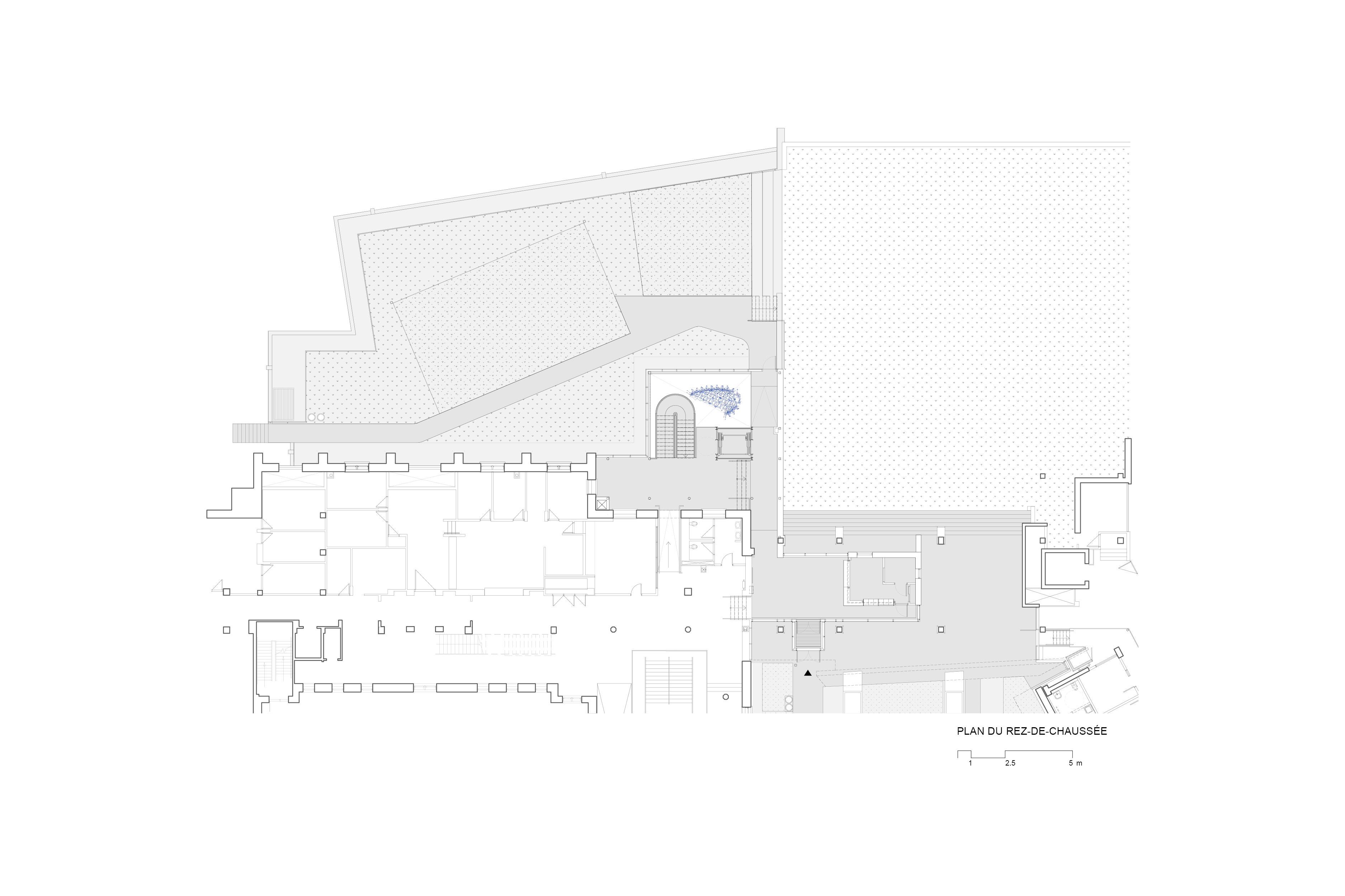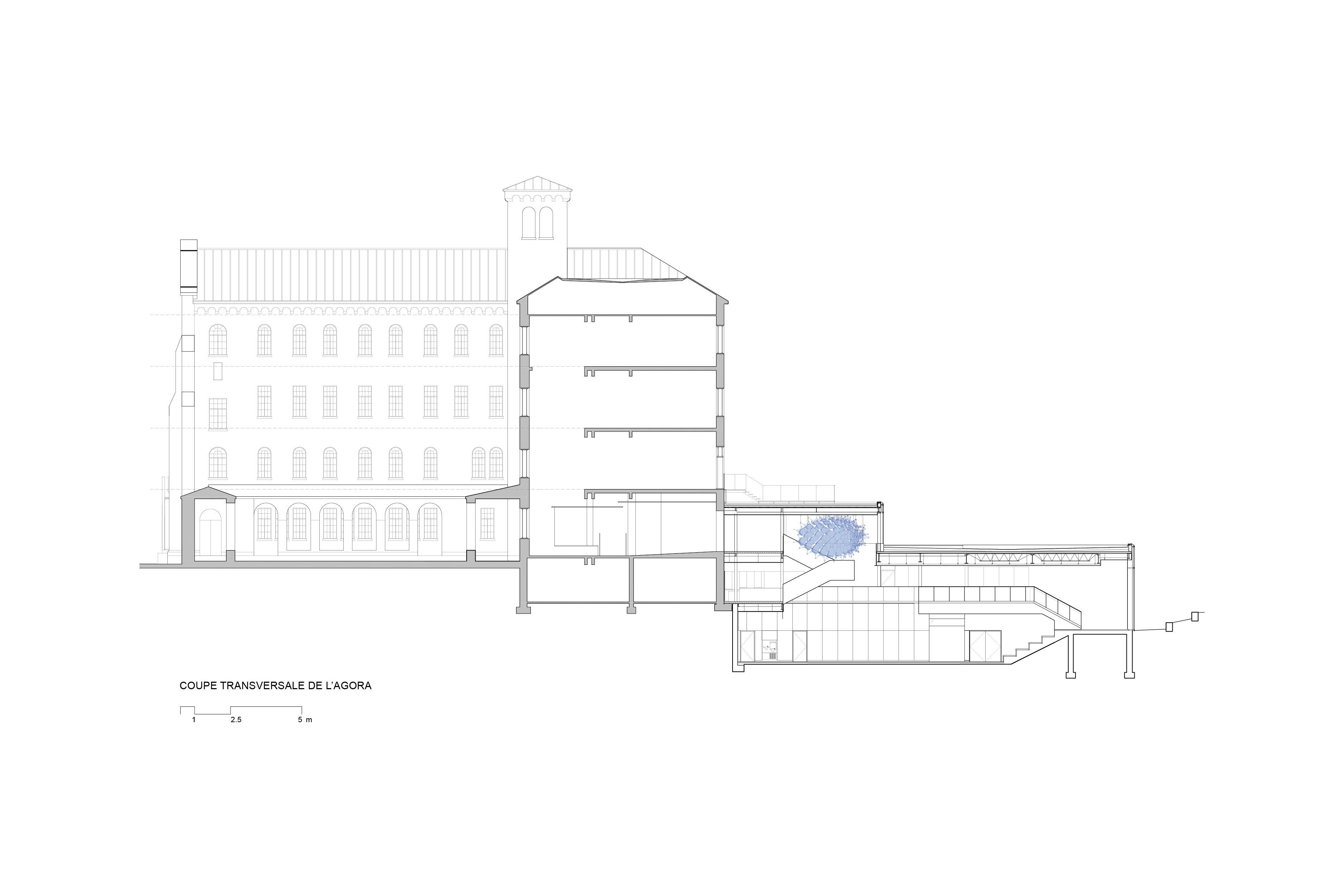 L’extension, discrètement insérée dans le talus, minimise l'impact sur le paysage tout en préservant l’intégrité du site. Un défi clé a été d’apporter la lumière naturelle dans ce bâtiment enfoui sur trois faces. L’Agora, un espace en double hauteur surmonté d’un édicule, permet à la lumière de pénétrer en profondeur.