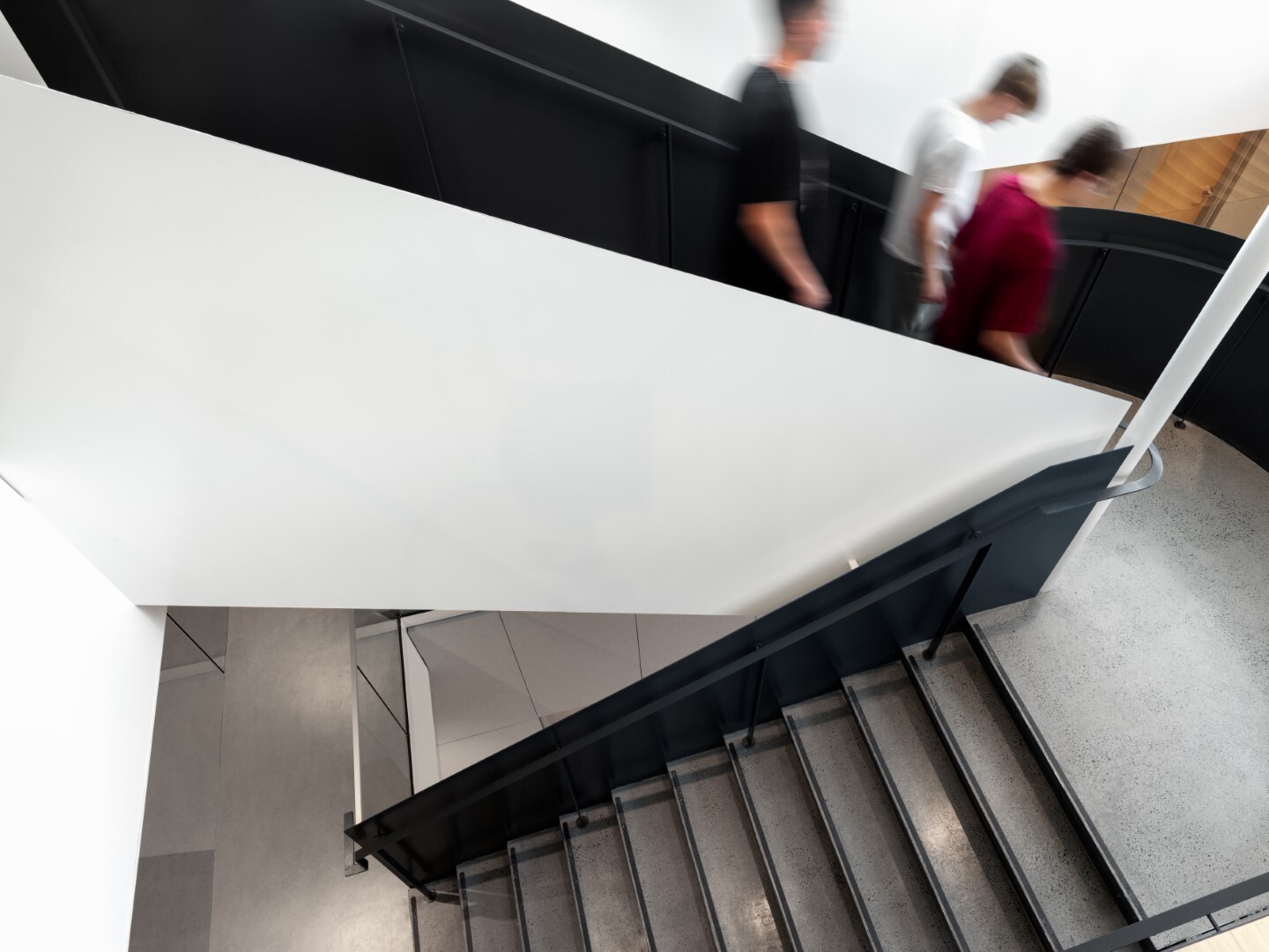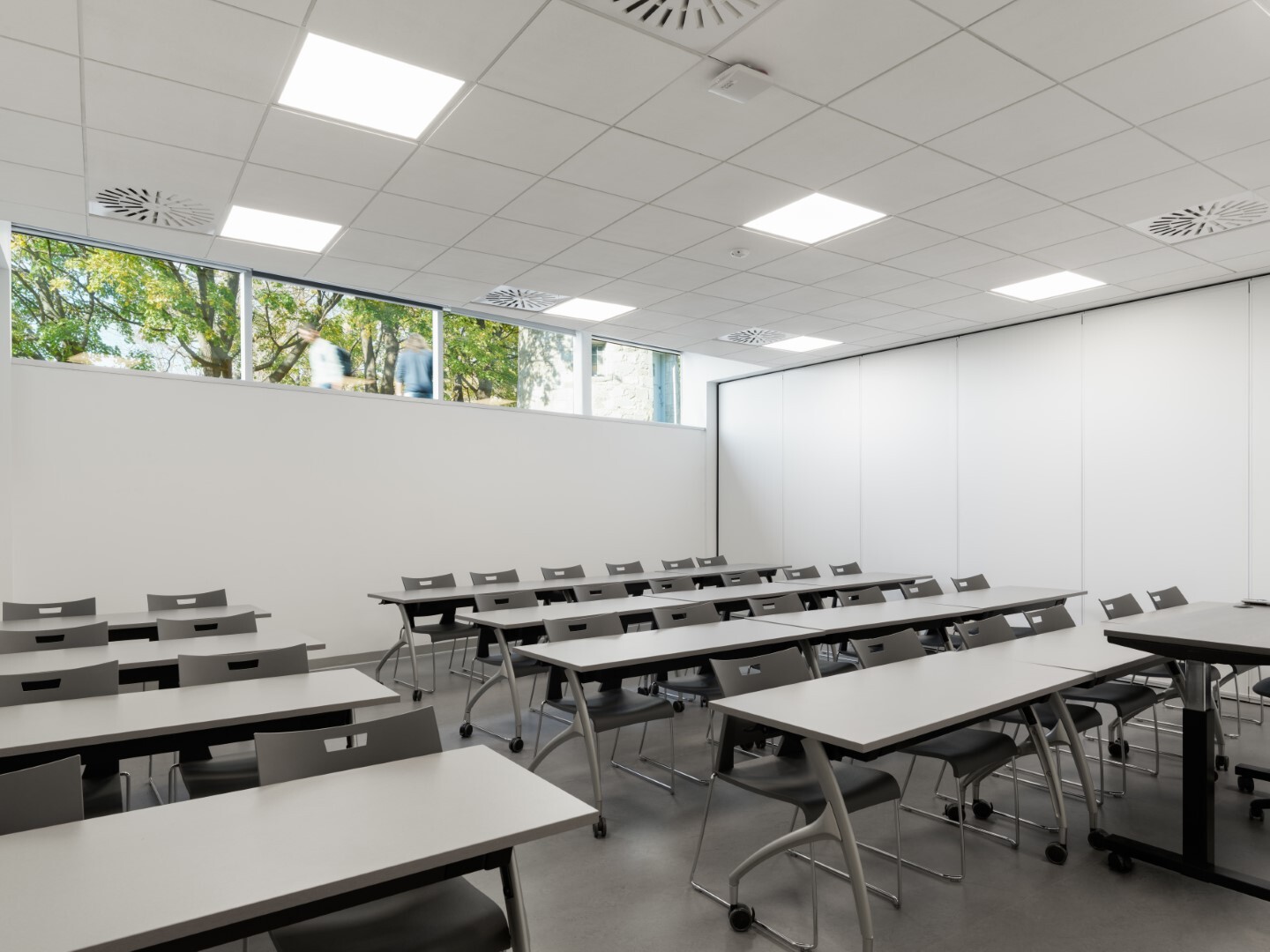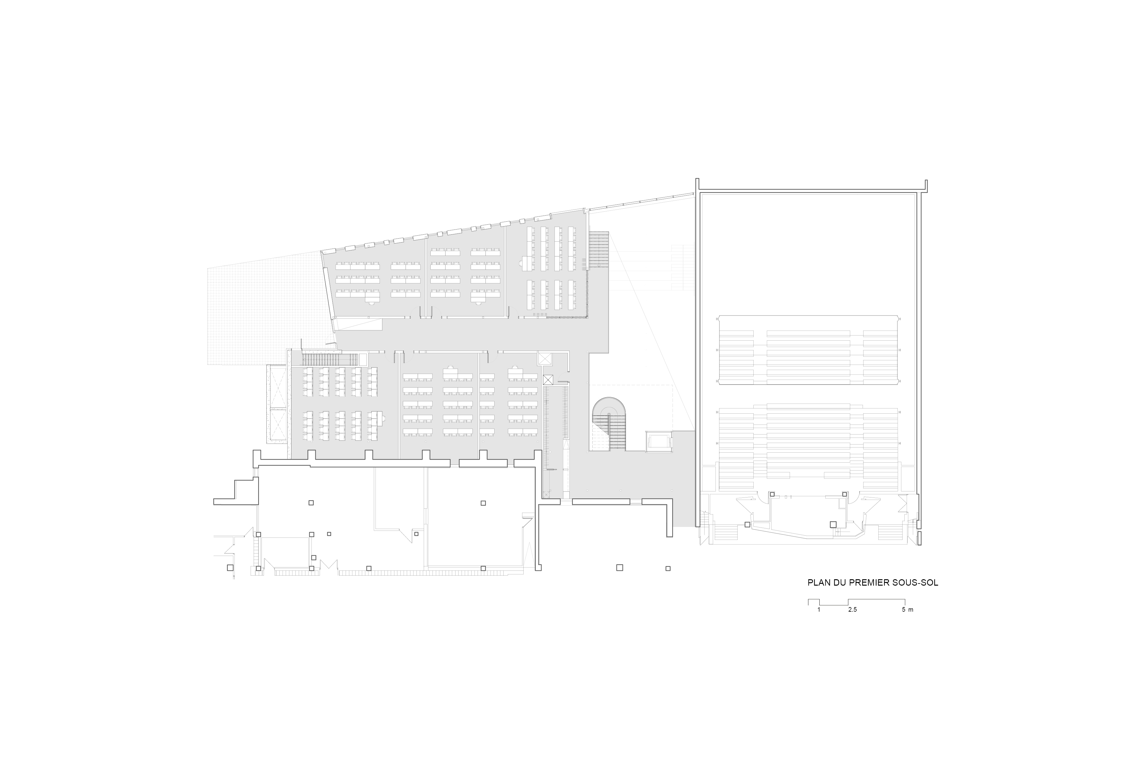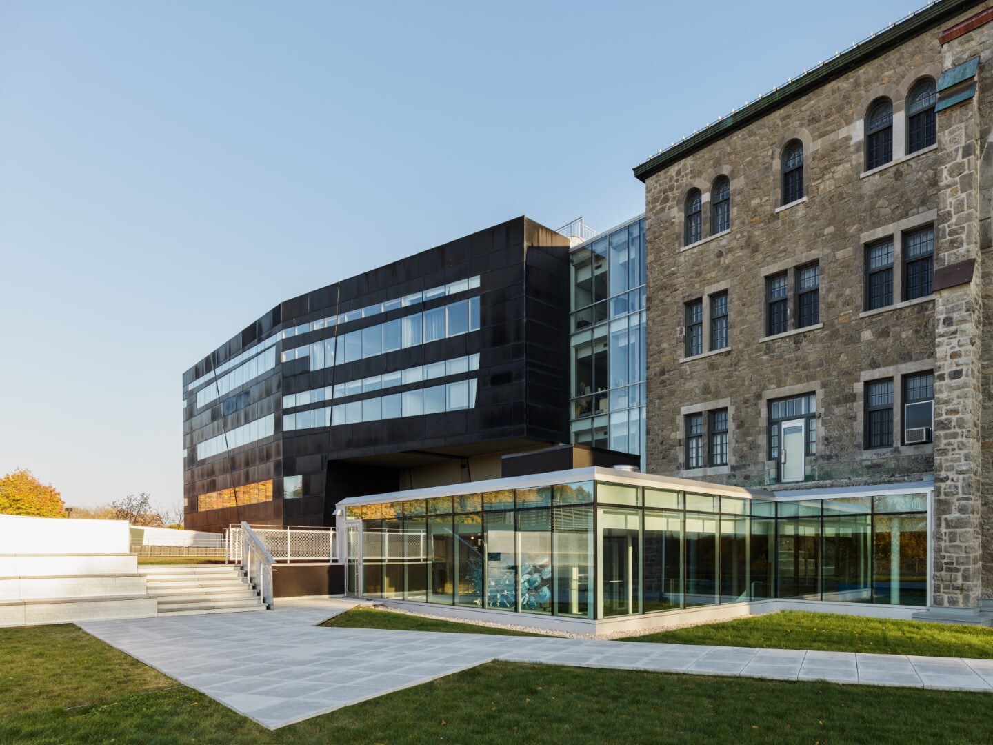 Une nouvelle entrée en verre assure la continuité spatiale et l’accès à la salle Pauline-Julien. La mezzanine, dans la cafétéria, accueille désormais des salles d’enseignement et des bureaux pour les professeurs.