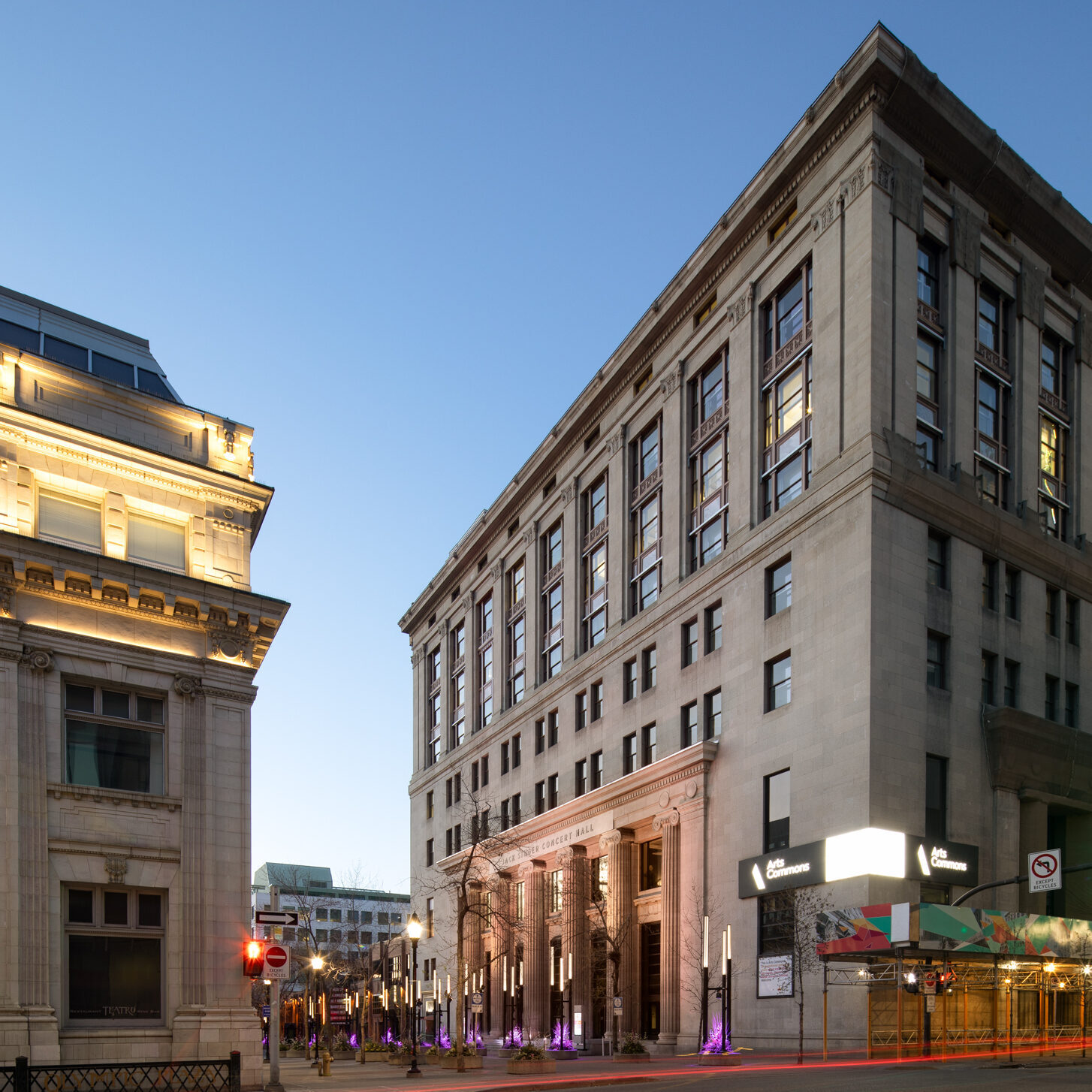 Le Bâtiment public de Calgary combine la fonctionnalité moderne avec l'élégance d'un important édifice patrimonial. Situé à l'extrémité de l'avenue Stephen, il a abrité les activités locales du gouvernement fédéral pendant la majeure partie du XXe siècle. Le mandat d'EVOQ était d'assurer la préservation et la durabilité de ce bâtiment emblématique en tant que bureaux municipaux et porte d'entrée d'une salle de spectacle de renommée. Son enveloppe en pierre calcaire de Tyndal, riche en fossiles, renforce à la fois sa durabilité et son aspect visuel. Inspiré par le style Beaux-Arts, le bâtiment présente des colonnes ioniques, des pilastres, des corniches décoratives et des fenêtres de style Chicago finies en fonte et en marbre. EVOQ a mis en œuvre un plan de restauration rigoureux, réparant ou remplaçant la maçonnerie et les éléments de fenêtres endommagés. À la fin du projet, le caractère patrimonial du bâtiment pouvait être pleinement apprécié.
