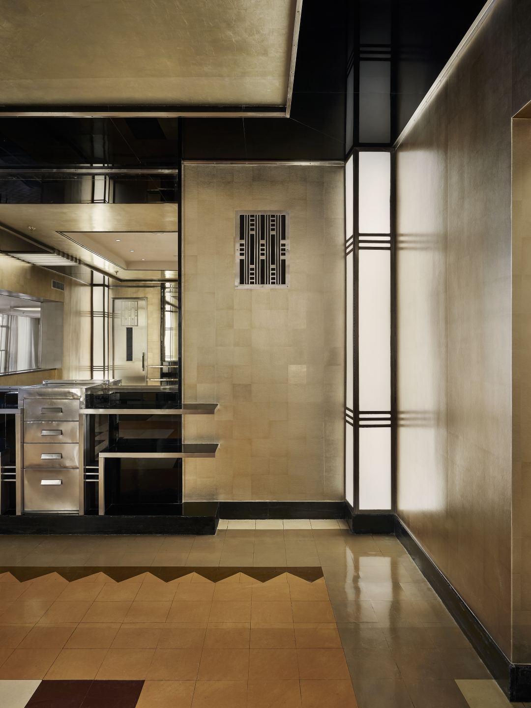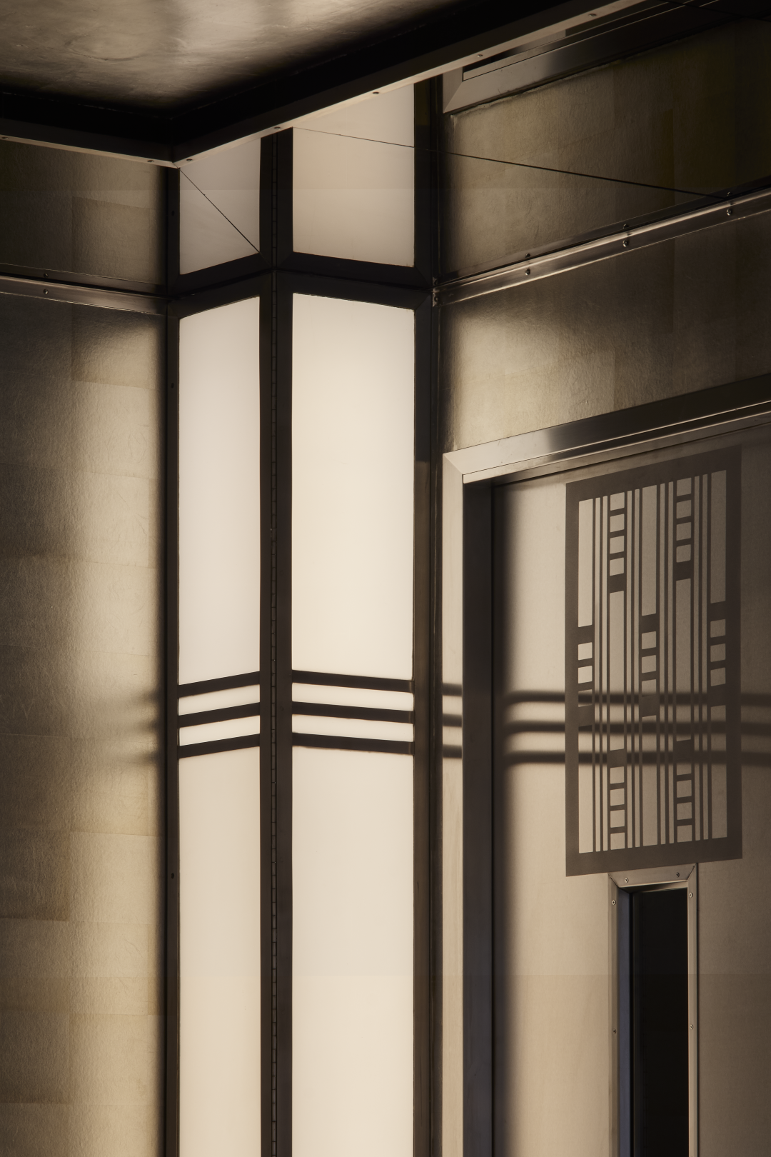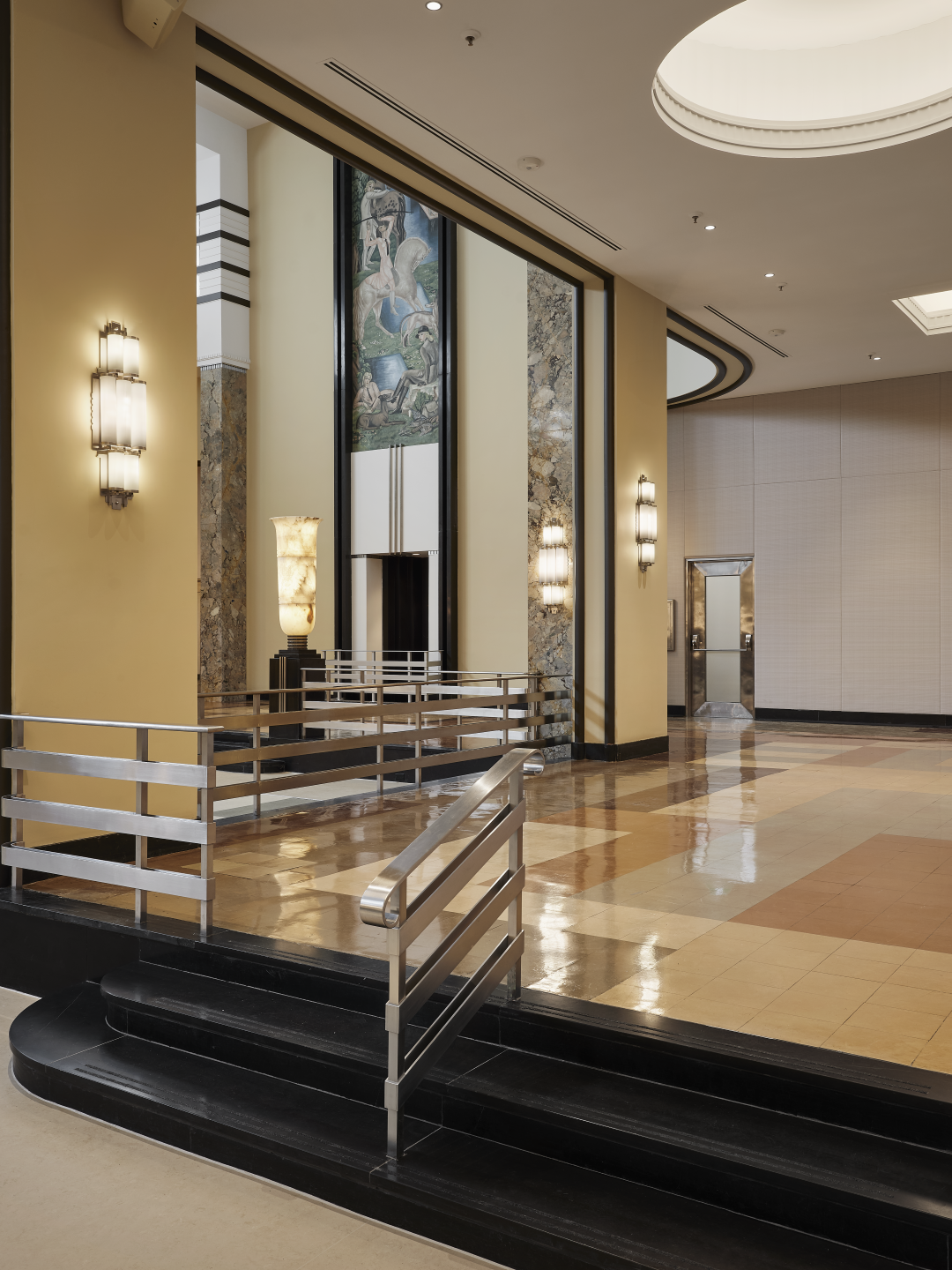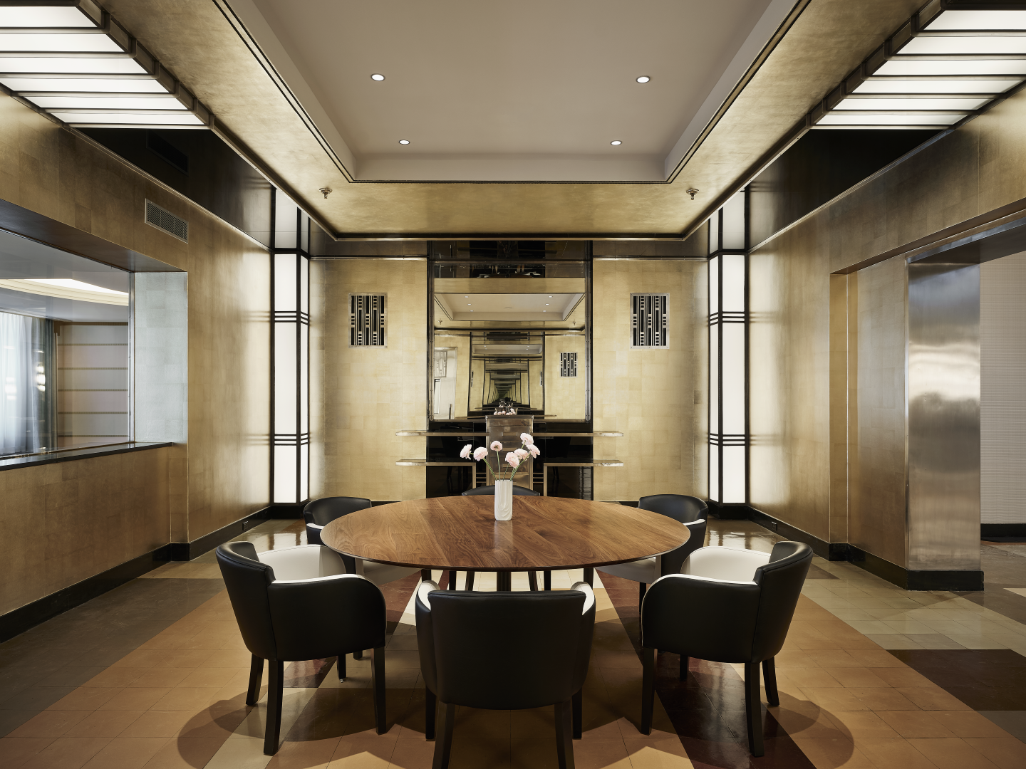 EVOQ a réuni une équipe multidisciplinaire (artisans et spécialistes en conservation d’art, de mobilier et de matériaux, ingénierie, éclairage, services alimentaires, scénographie et acoustique, etc.) afin de restaurer et réhabiliter les intérieurs patrimoniaux du 9e. Suite à l’évaluation de l’état du bâtiment et de ses éléments distinctifs, EVOQ a défini une stratégie de conservation permettant de redonner au restaurant sa splendeur d’origine tout en préservant sa grande valeur patrimoniale. Par exemple, l’analyse fine des couches de peinture a permis de retrouver la palette des années 1930, confirmant la vision et l’intention de Jacques Carlu, architecte concepteur d’origine.