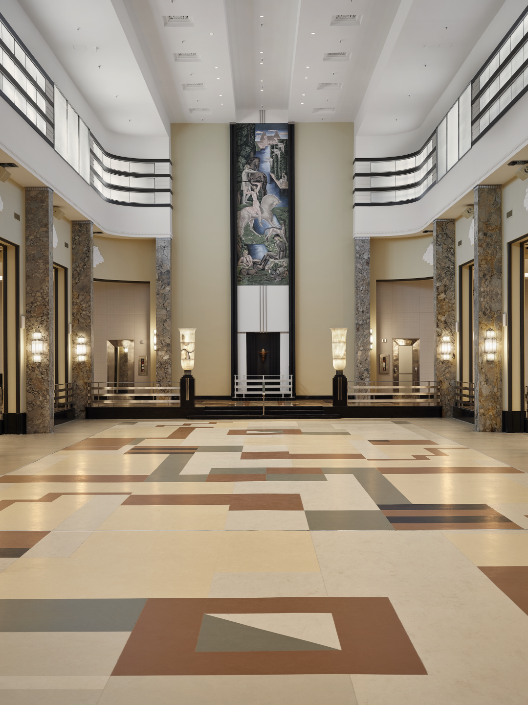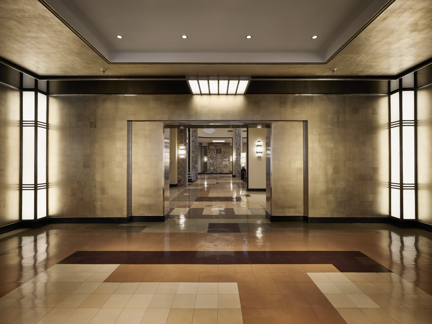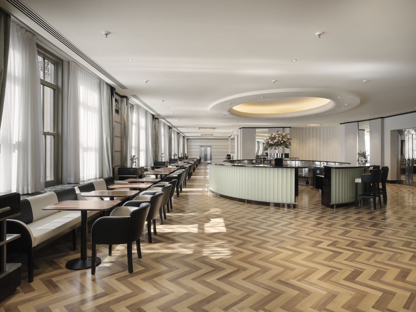 EVOQ a réuni une équipe multidisciplinaire (artisans et spécialistes en conservation d’art, de mobilier et de matériaux, ingénierie, éclairage, services alimentaires, scénographie et acoustique, etc.) afin de restaurer et réhabiliter les intérieurs patrimoniaux du 9e. Suite à l’évaluation de l’état du bâtiment et de ses éléments distinctifs, EVOQ a défini une stratégie de conservation permettant de redonner au restaurant sa splendeur d’origine tout en préservant sa grande valeur patrimoniale. Par exemple, l’analyse fine des couches de peinture a permis de retrouver la palette des années 1930, confirmant la vision et l’intention de Jacques Carlu, architecte concepteur d’origine.