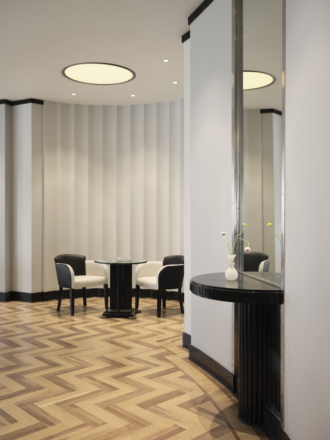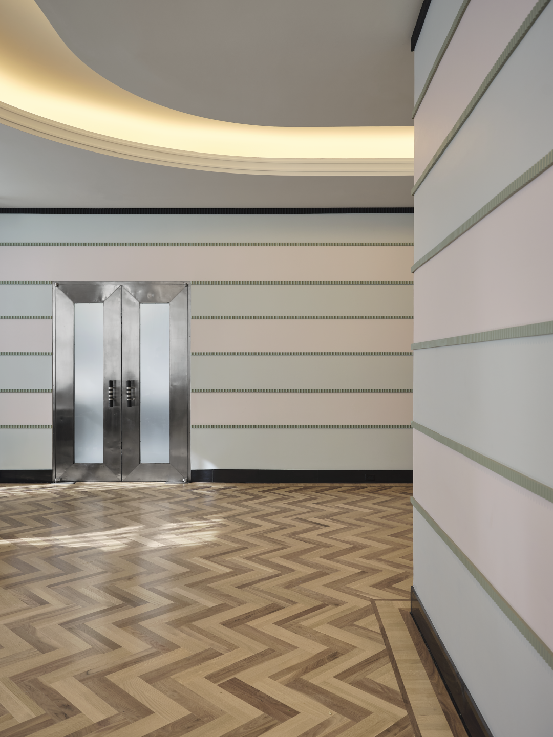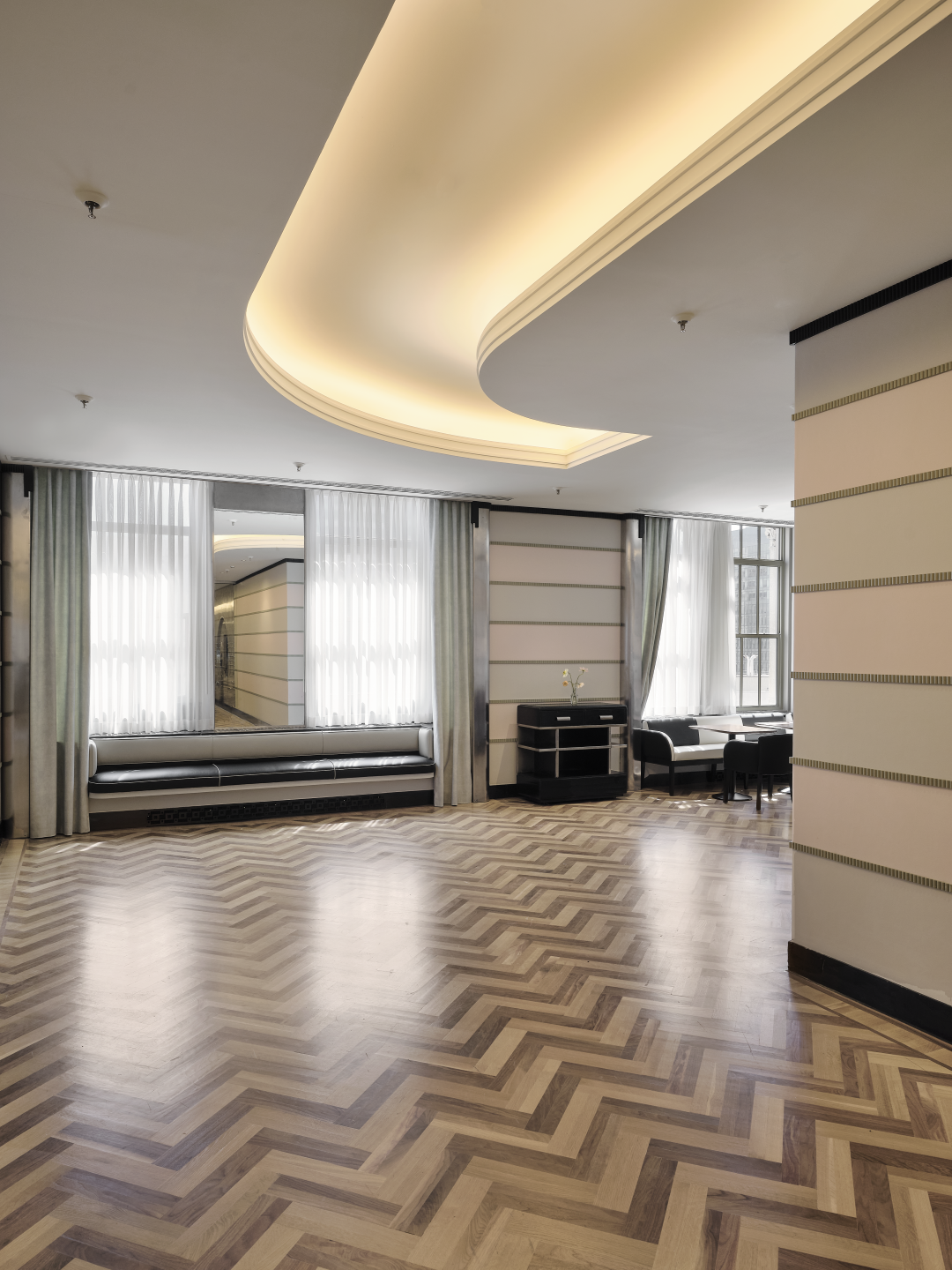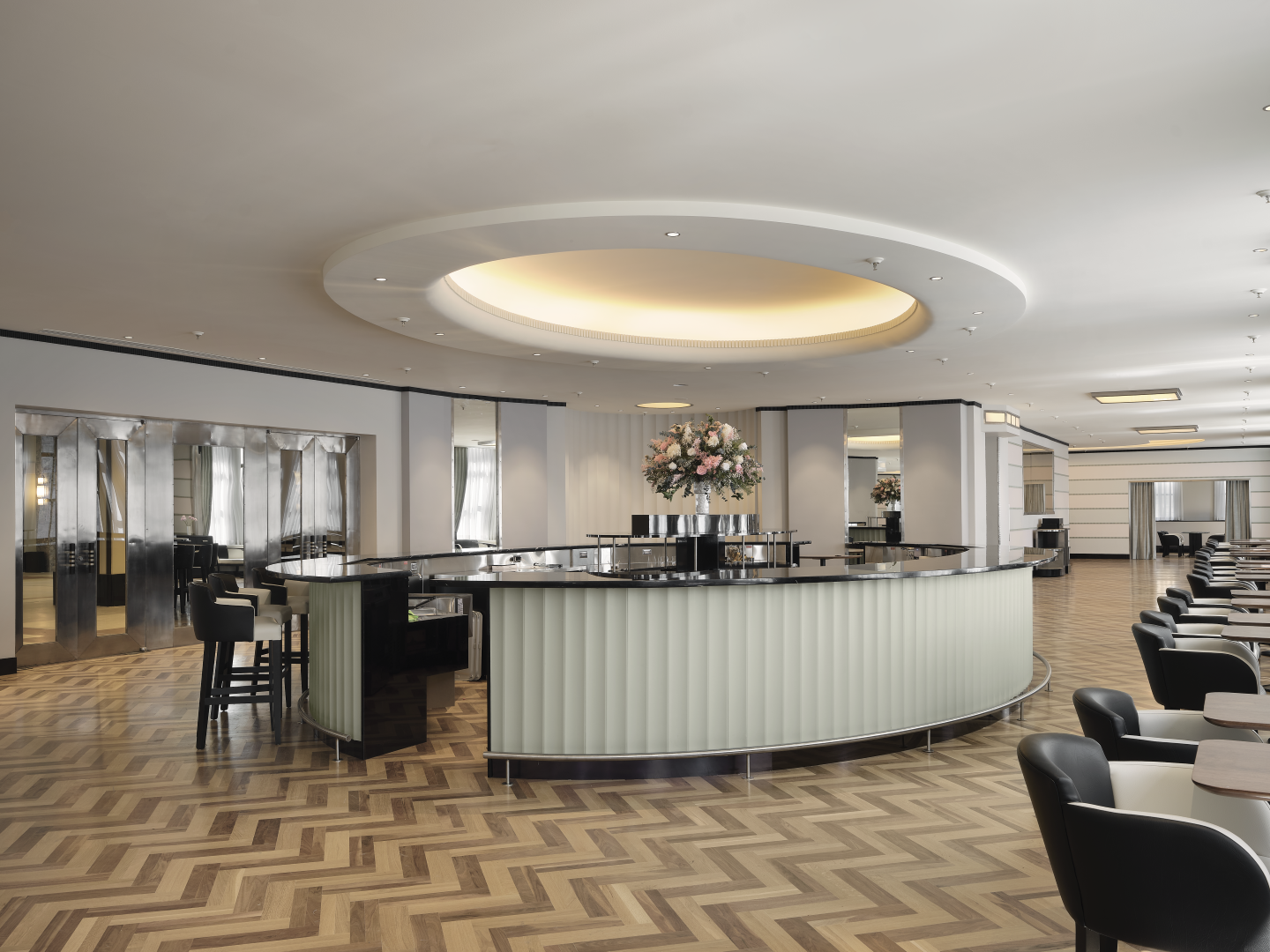 EVOQ a réuni une équipe multidisciplinaire (artisans et spécialistes en conservation d’art, de mobilier et de matériaux, ingénierie, éclairage, services alimentaires, scénographie et acoustique, etc.) afin de restaurer et réhabiliter les intérieurs patrimoniaux du 9e. Suite à l’évaluation de l’état du bâtiment et de ses éléments distinctifs, EVOQ a défini une stratégie de conservation permettant de redonner au restaurant sa splendeur d’origine tout en préservant sa grande valeur patrimoniale. Par exemple, l’analyse fine des couches de peinture a permis de retrouver la palette des années 1930, confirmant la vision et l’intention de Jacques Carlu, architecte concepteur d’origine.
