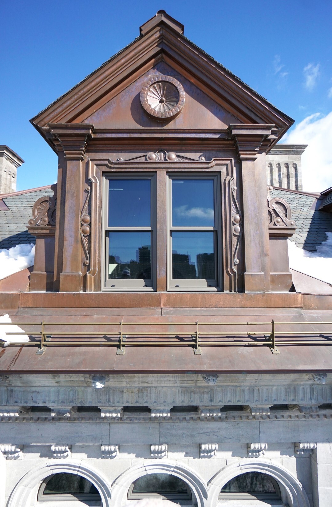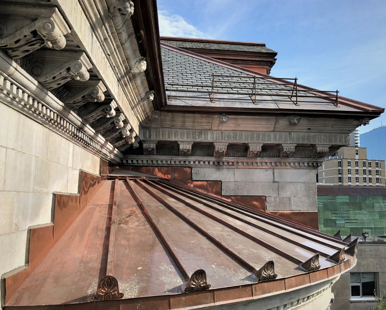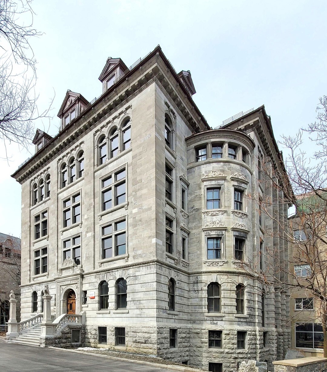 Le bâtiment Macdonald-Harrington, conçu entre 1896 et 1897 par l'architecte Andrew Taylor, est un excellent exemple de l'architecture de la fin du XIXe siècle sur le campus de l'Université McGill. Composé de murs porteurs en maçonnerie et de détails en pierre calcaire finement sculptés, le bâtiment présente un toit en ardoise en pavillon, orné de crêtes et de faîtages en cuivre ainsi que de lucarnes richement décorées. Au fil du temps, plusieurs campagnes de réparation ont modifié la toiture, ne laissant que les côtés des lucarnes recouverts de cuivre et certains éléments décoratifs d'origine. Mandaté pour restaurer le caractère historique et la durabilité du bâtiment, EVOQ a abordé le projet de réhabilitation de maçonnerie et de restauration de la toiture avec une méthodologie guidée par les Normes et lignes directrices pour la conservation des lieux patrimoniaux au Canada. Cela comprenait le remplacement des éléments décoratifs en cuivre et une réinterprétation des caractéristiques décoratives perdues au fils du temps et la restauration de la maçonnerie sur l’ensemble du bâtiment. Des pare-neiges en laiton ont été ajoutés pour renforcer la sécurité, choisis pour leur compatibilité avec le cuivre et leur durabilité à long terme. L'approche distinctive d'EVOQ a permis de préserver l'intégrité architecturale du bâtiment tout en assurant sa pérennité afin qu'il demeure un patrimoine durable pour les générations futures.