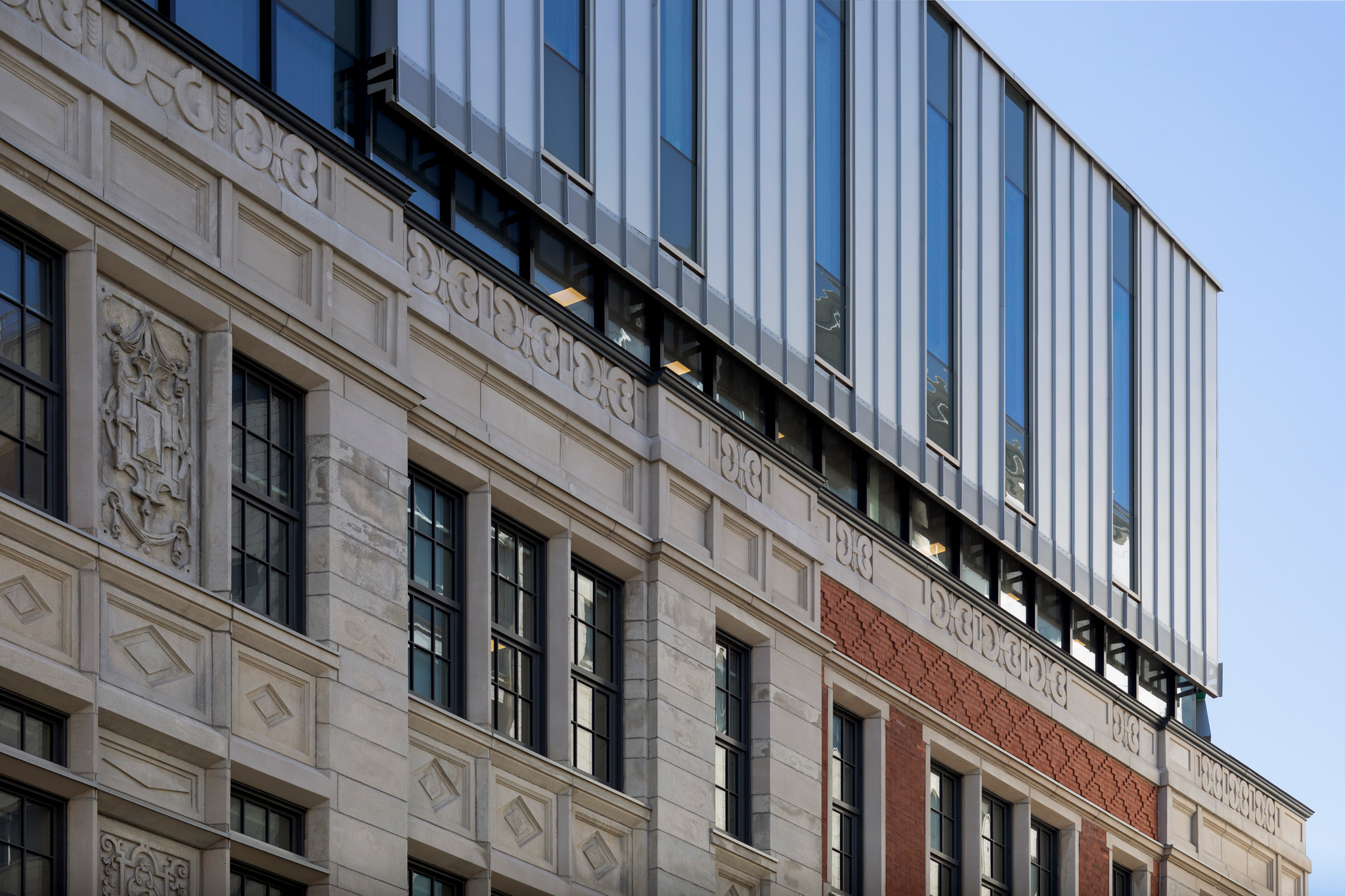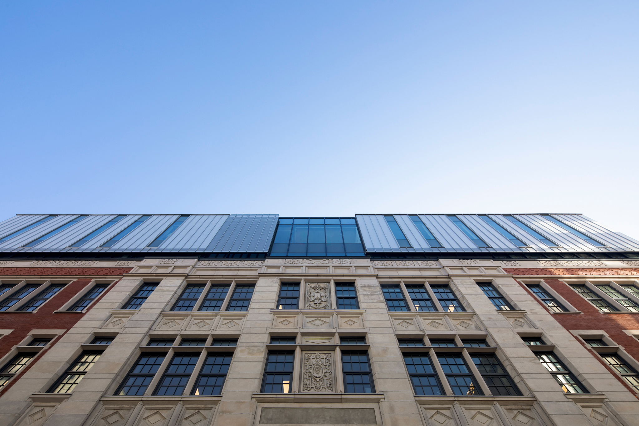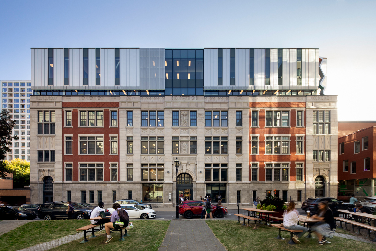 Cette adjonction de langages architecturaux différenciés, harmonieux dans leur dialogue, signale le nouveau statut du lieu. Grâce à cet agrandissement contemporain de deux étages, le nouveau pavillon peut désormais accueillir 1 500 personnes dans des espaces d’apprentissage et de collaboration dotés d’équipements audiovisuels de pointe.