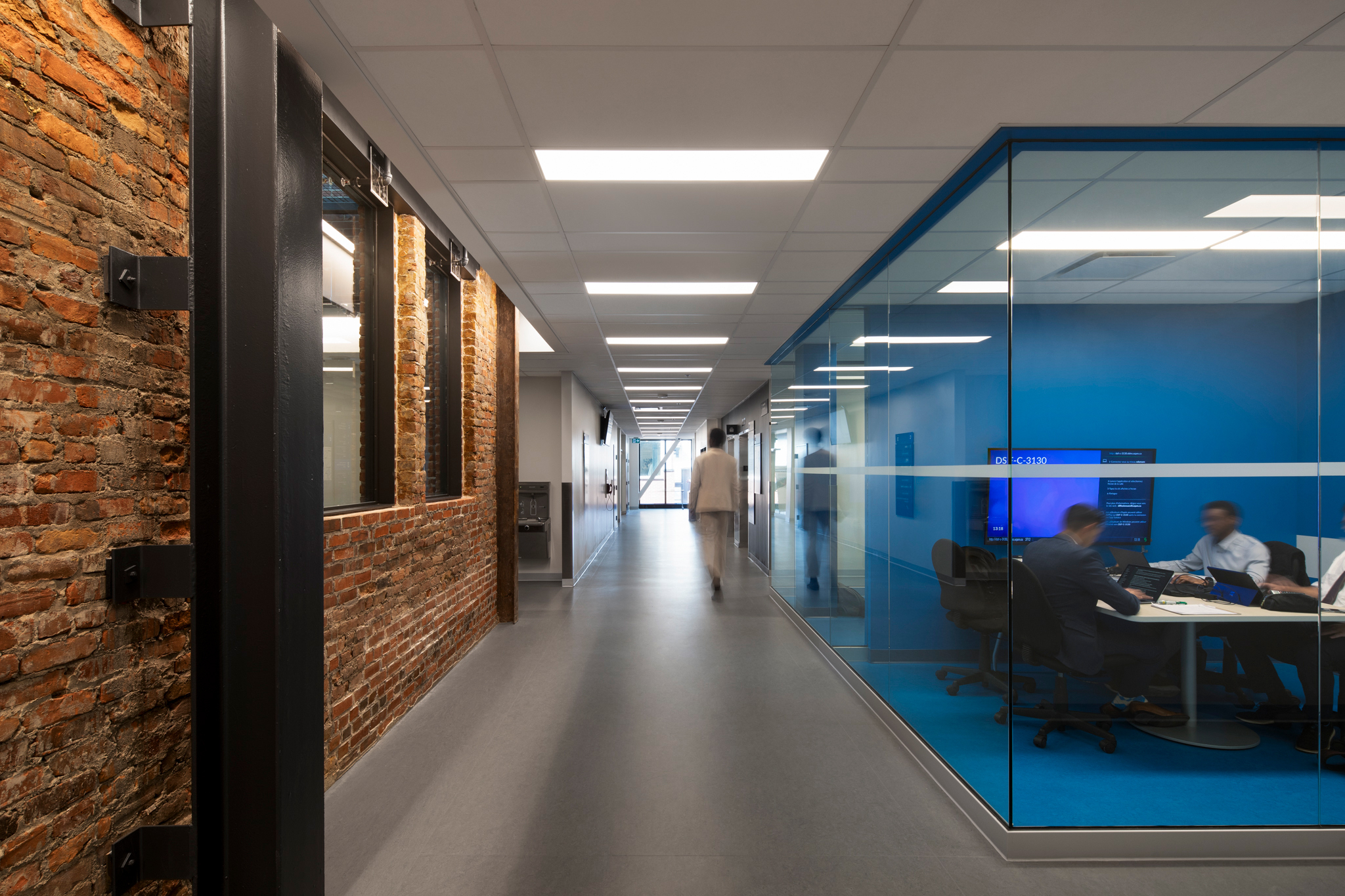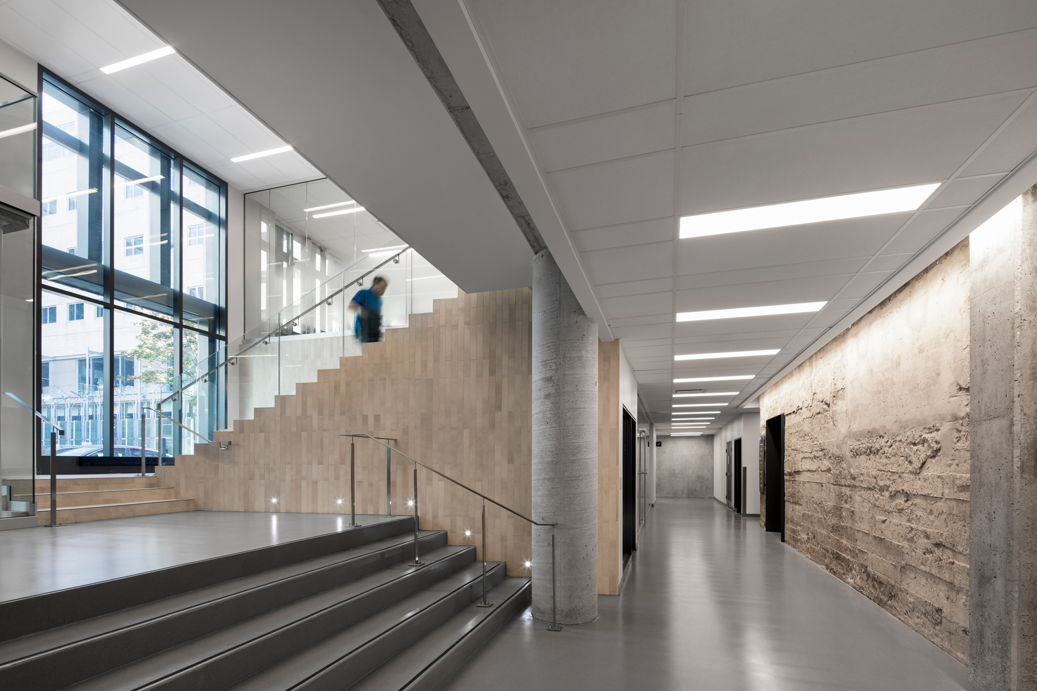 L’efficacité de l’enveloppe offre une meilleure performance énergétique, une récupération de chaleur en hiver, une protection à l’éblouissement et à la surchauffe en été. Un toit-terrasse aménagé et un généreux lanterneau enrichissent l’expérience des lieux par le maillage de l’intérieur à l’extérieur et l’apport de lumière naturelle abondante au cœur du bâtiment.