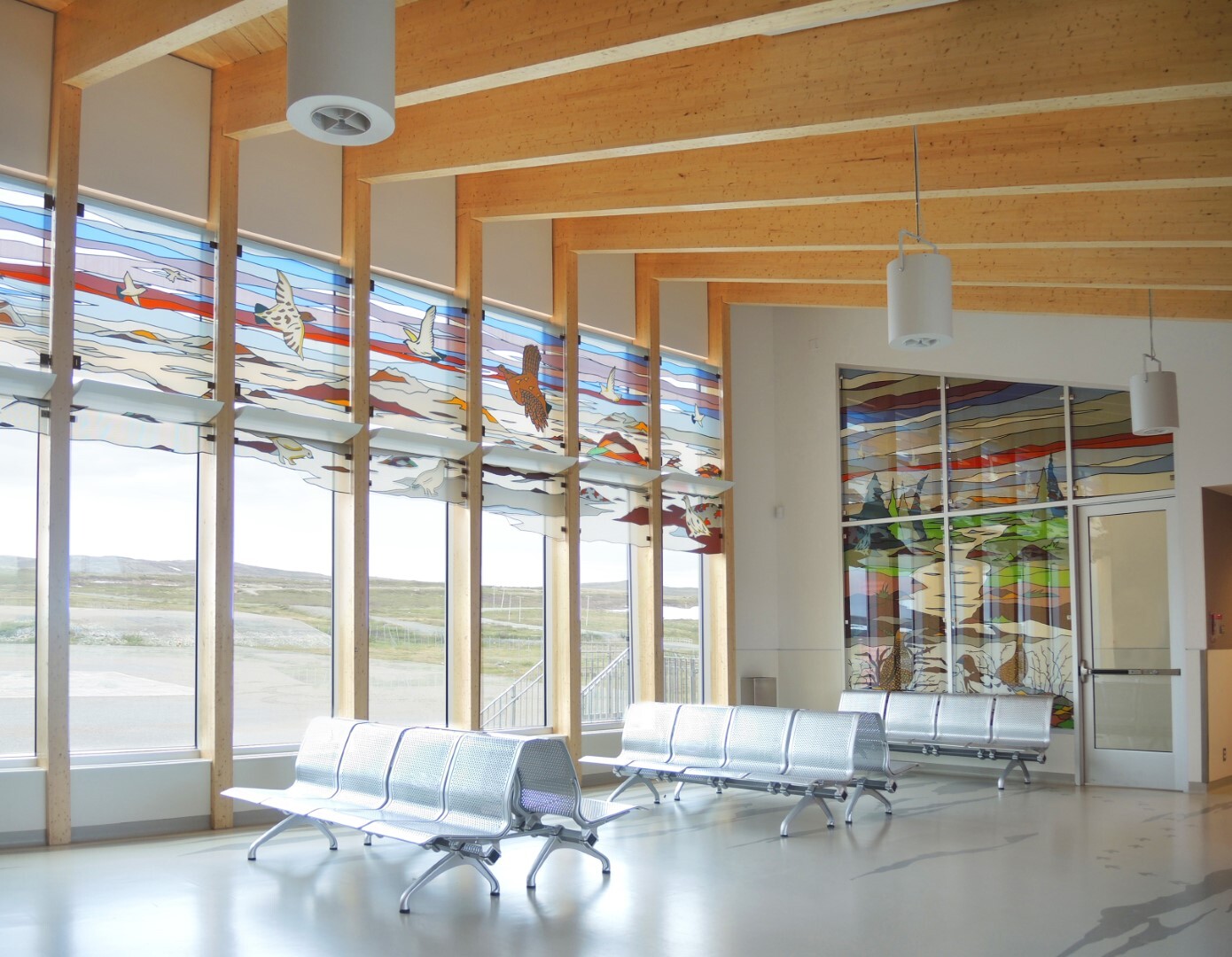 Contrairement aux aérogares existantes, les nouvelles aérogares du programme ont toutes une identité différente. À partir d’une structure de bois commune, chaque aérogare rénovée reflète le caractère du village où elle se trouve, représentant la communauté qu’elle dessert. Les aérogares sont conçues pour communiquer un thème choisi par chaque communauté. Ce thème est développé dans le traitement des formes et des couleurs de l’architecture, ainsi que par l’oeuvre d’art réalisée en collaboration avec un artiste choisi par concours dans chaque communauté.